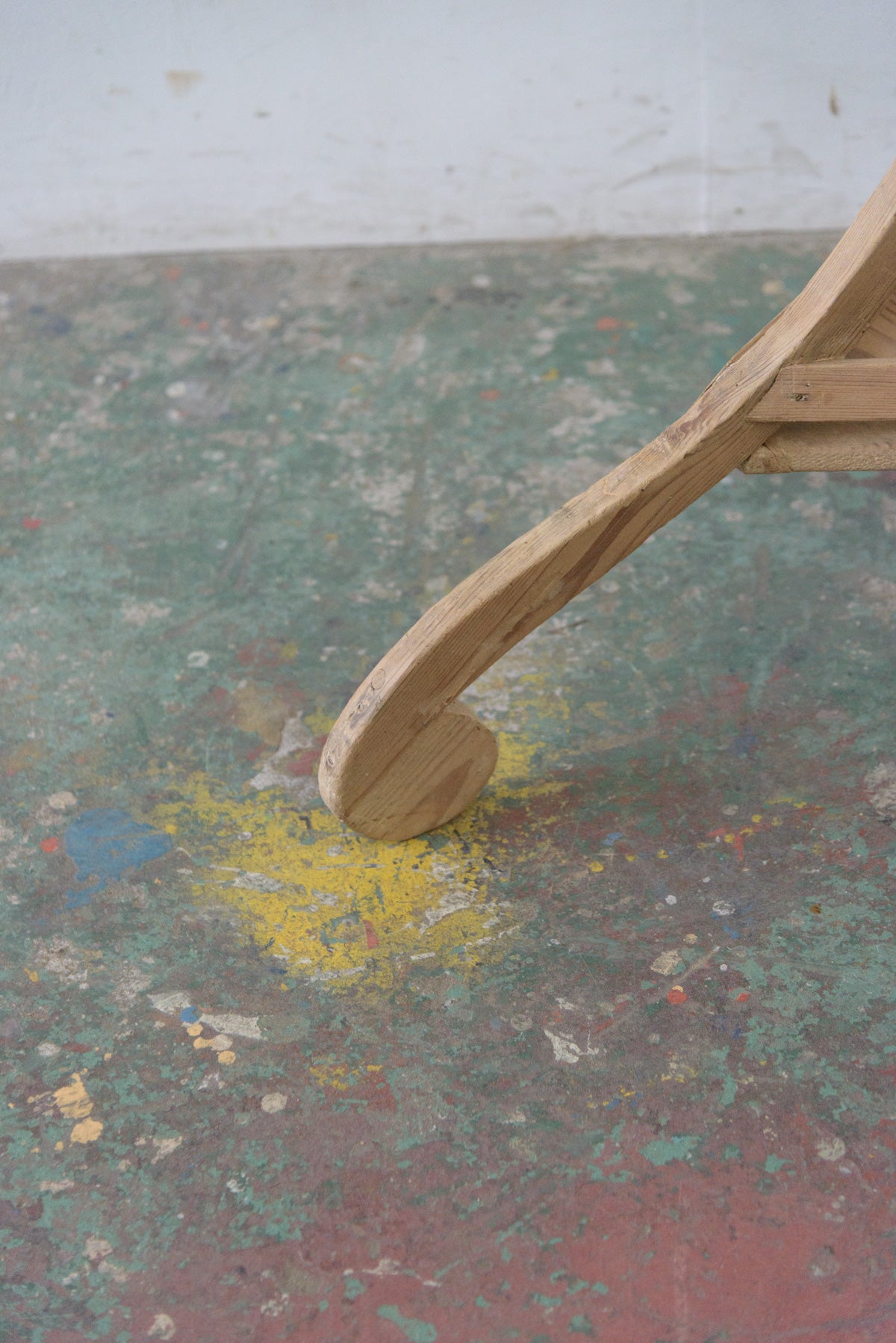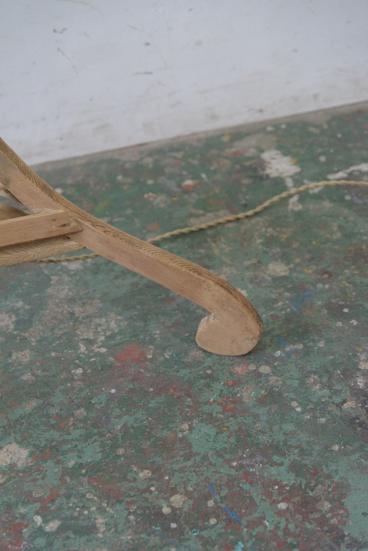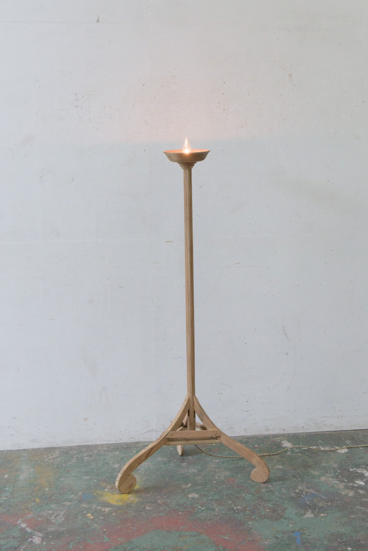 材質はパイン、脚のつくりが特徴的で安定感もあり、しっかり実用できます。電気部品は日本の新しいものに交換してます。口金は一般的なE17。コードの長さは約2.5mでコンセントプラグ仕様。コンセントから30cm程度の位置にスイッチ付き。