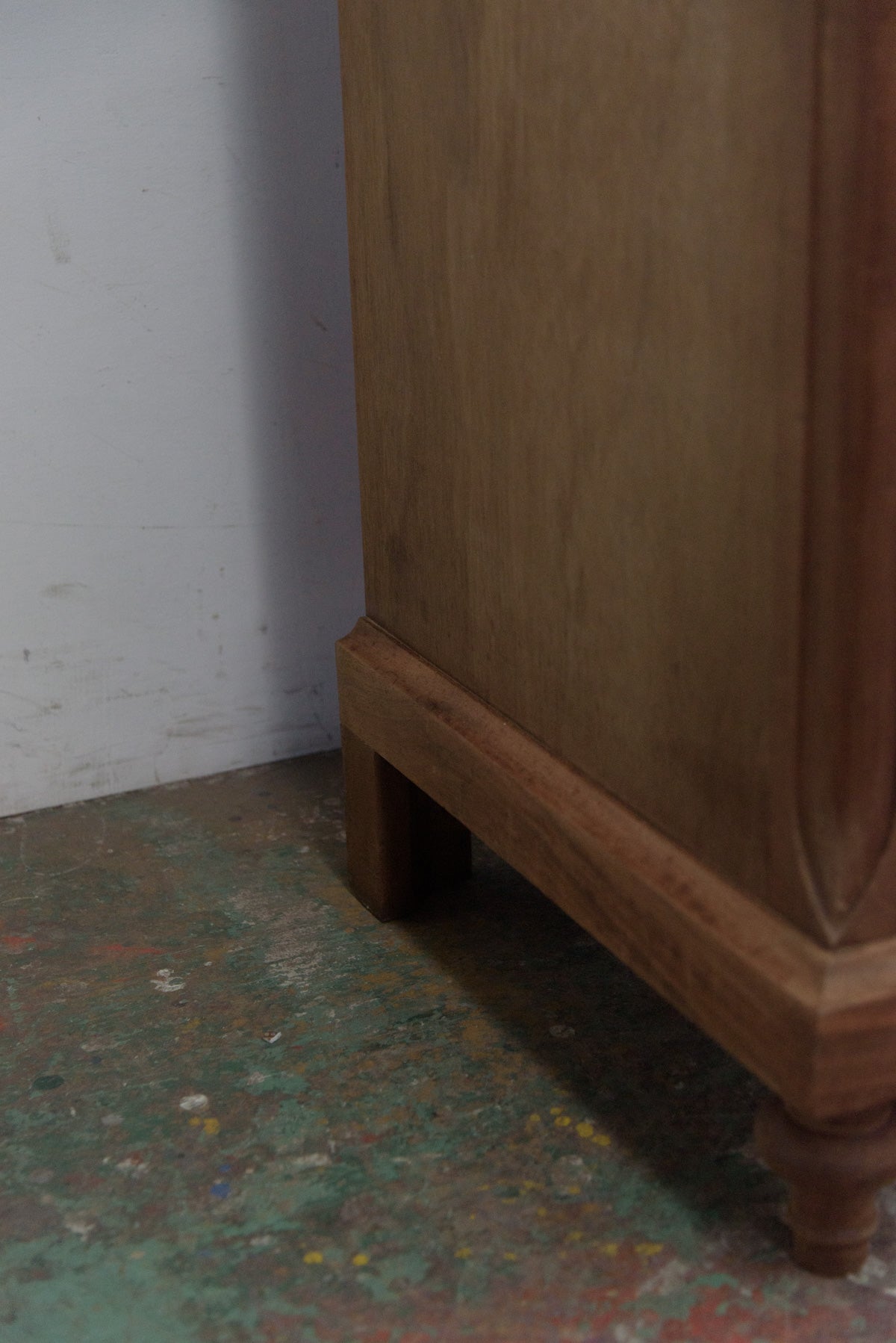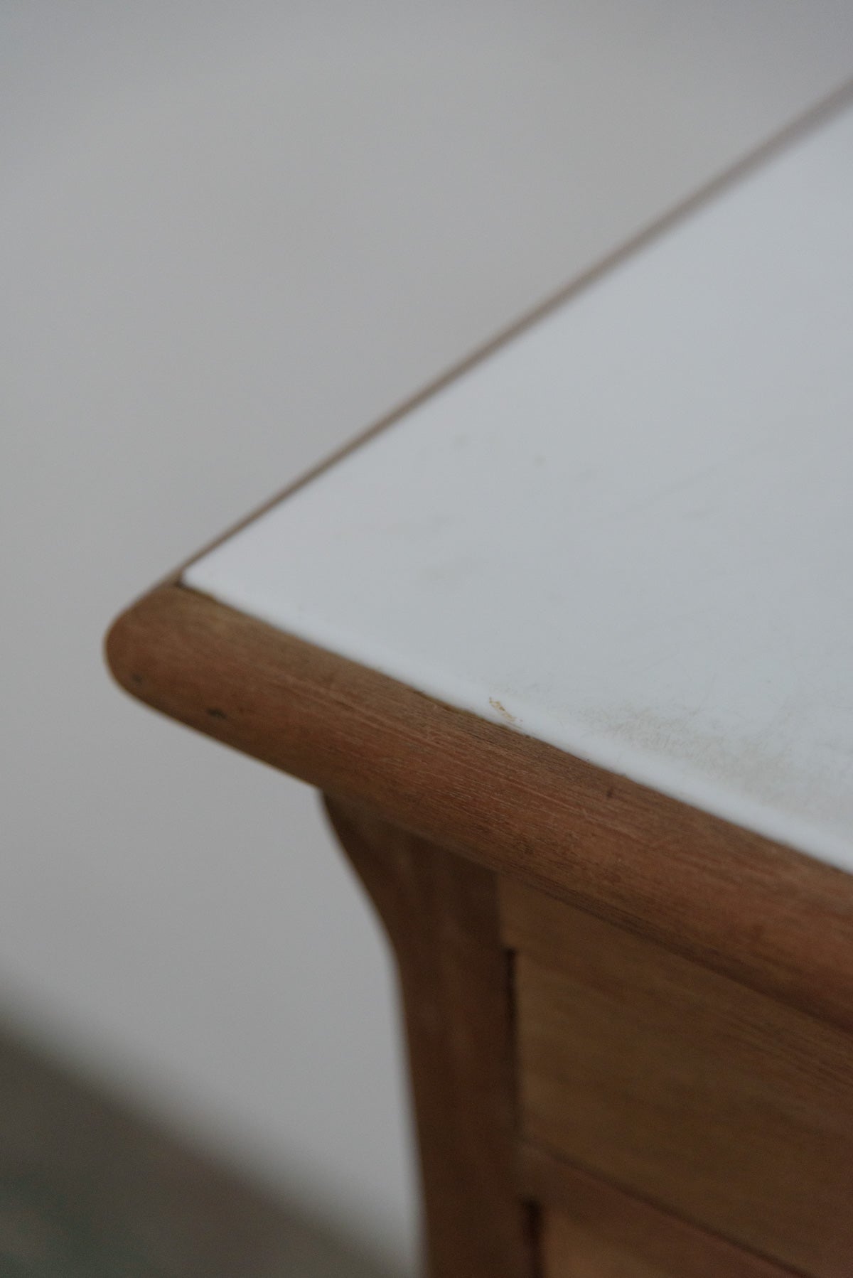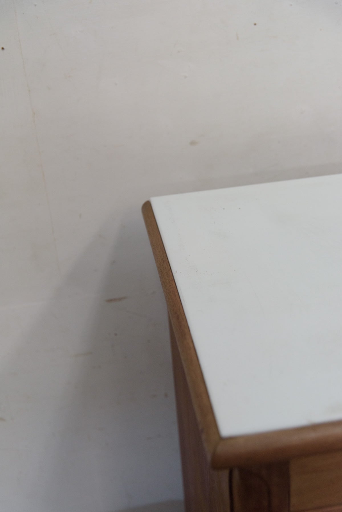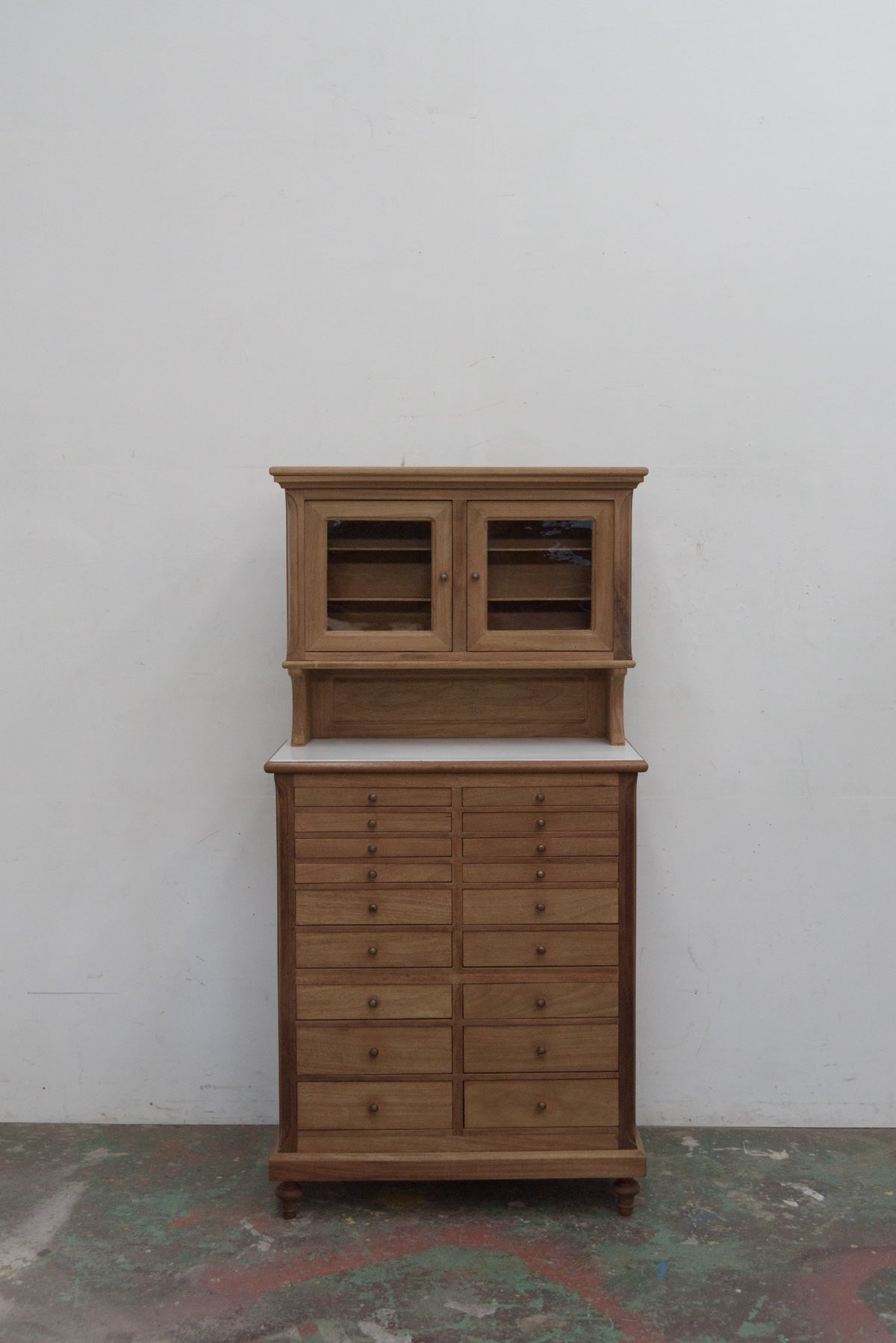 マホガニーを贅沢に使用した業務用キャビネット。白い天板は人工大理石、扉や引き出しの動きも非常にスムーズです。薄い引出しは書類を仕分けする事務家具としても使用できます。トップのガラス扉内に消毒臭が残っています。プラスドライバーで上中下に分割できます。