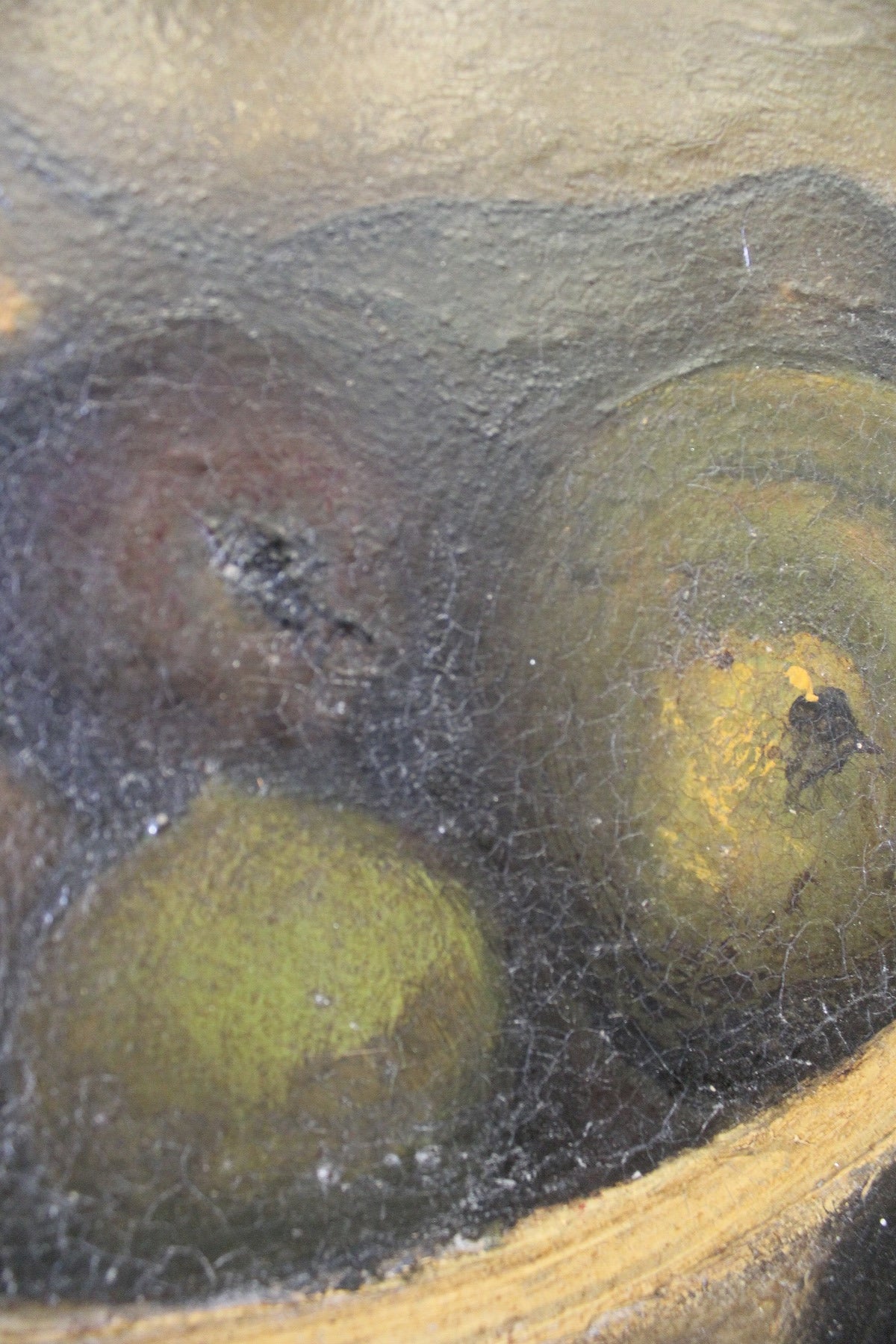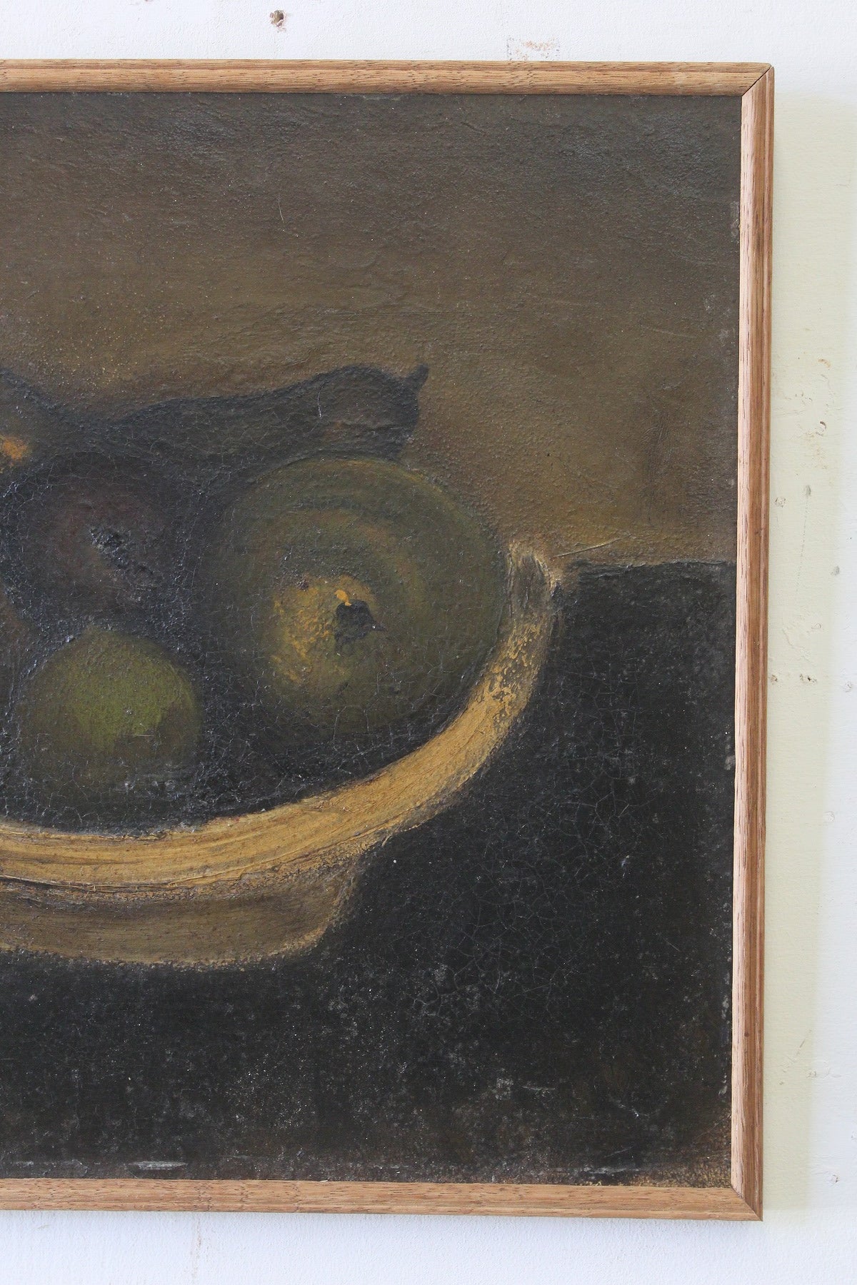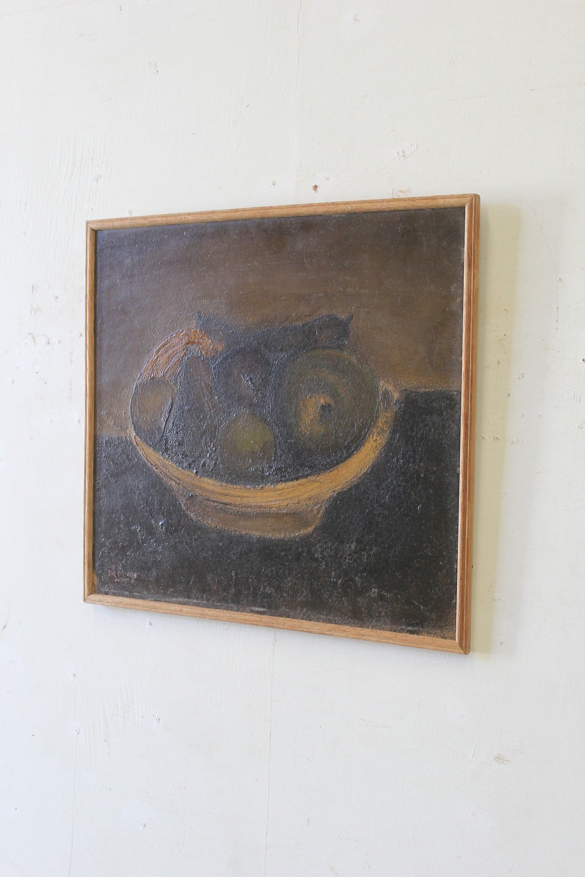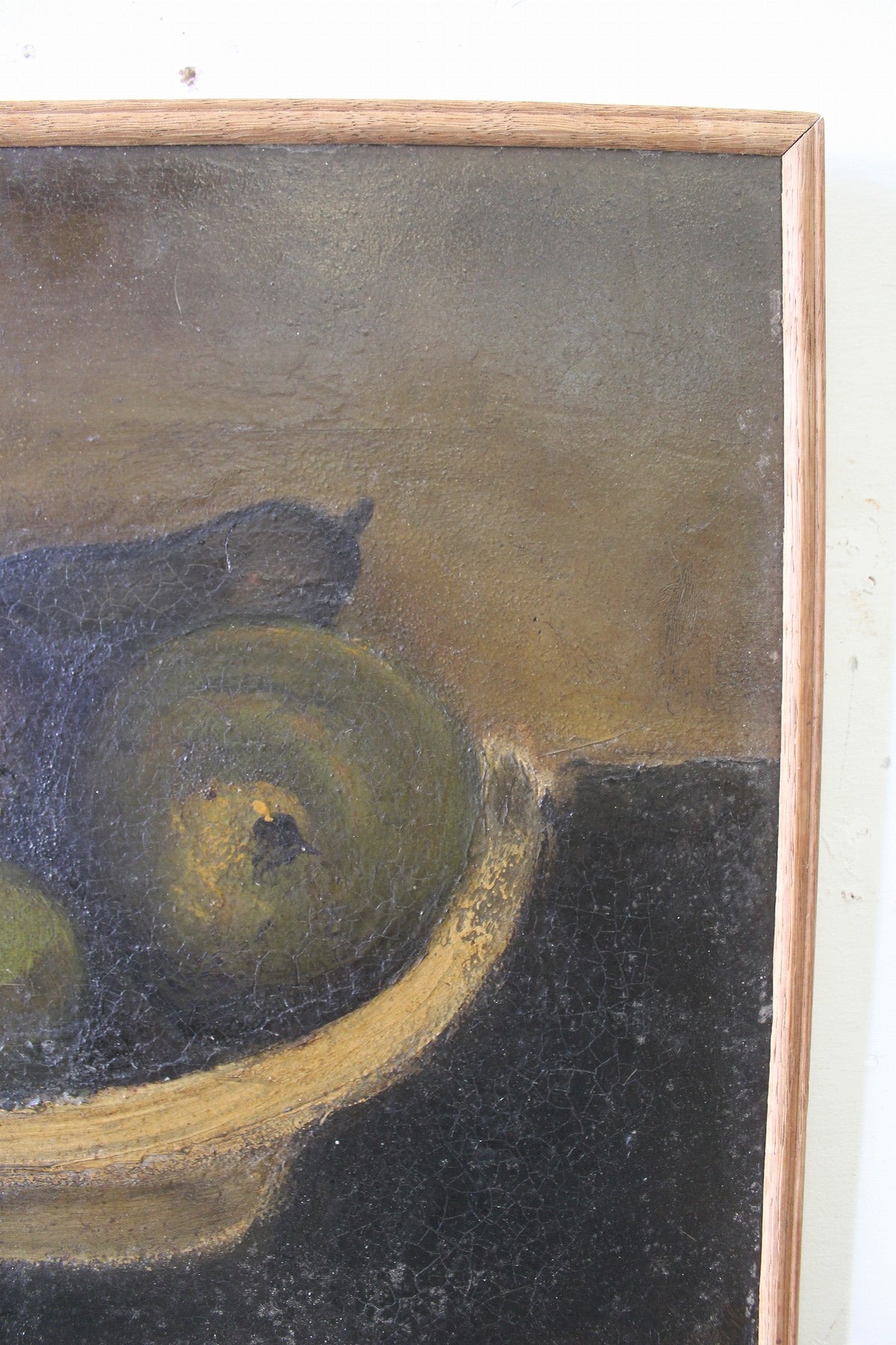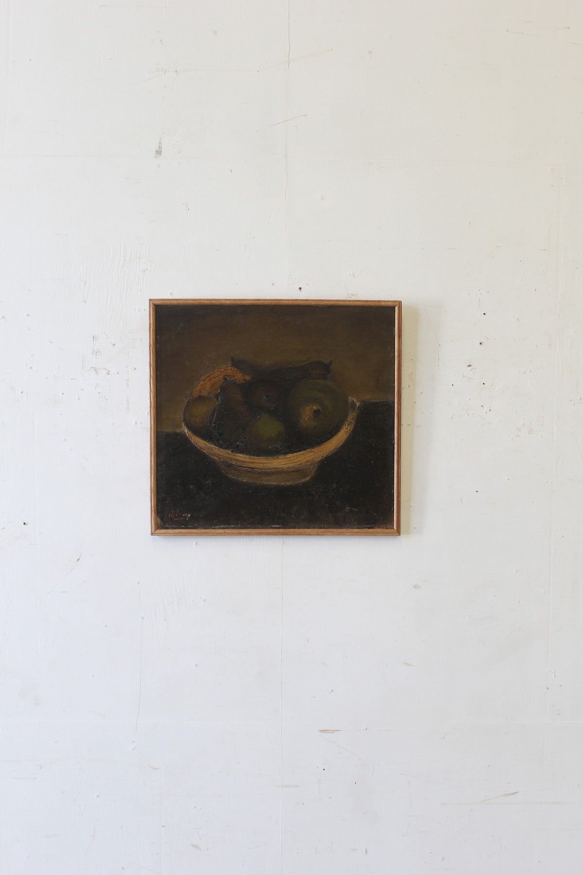 作者や詳細は不明ですが、落ち着いた色調のクラシックな静物画。古い絵ならではの絵肌のひび割れもあり、存在感のある静かで力強い作品です。
