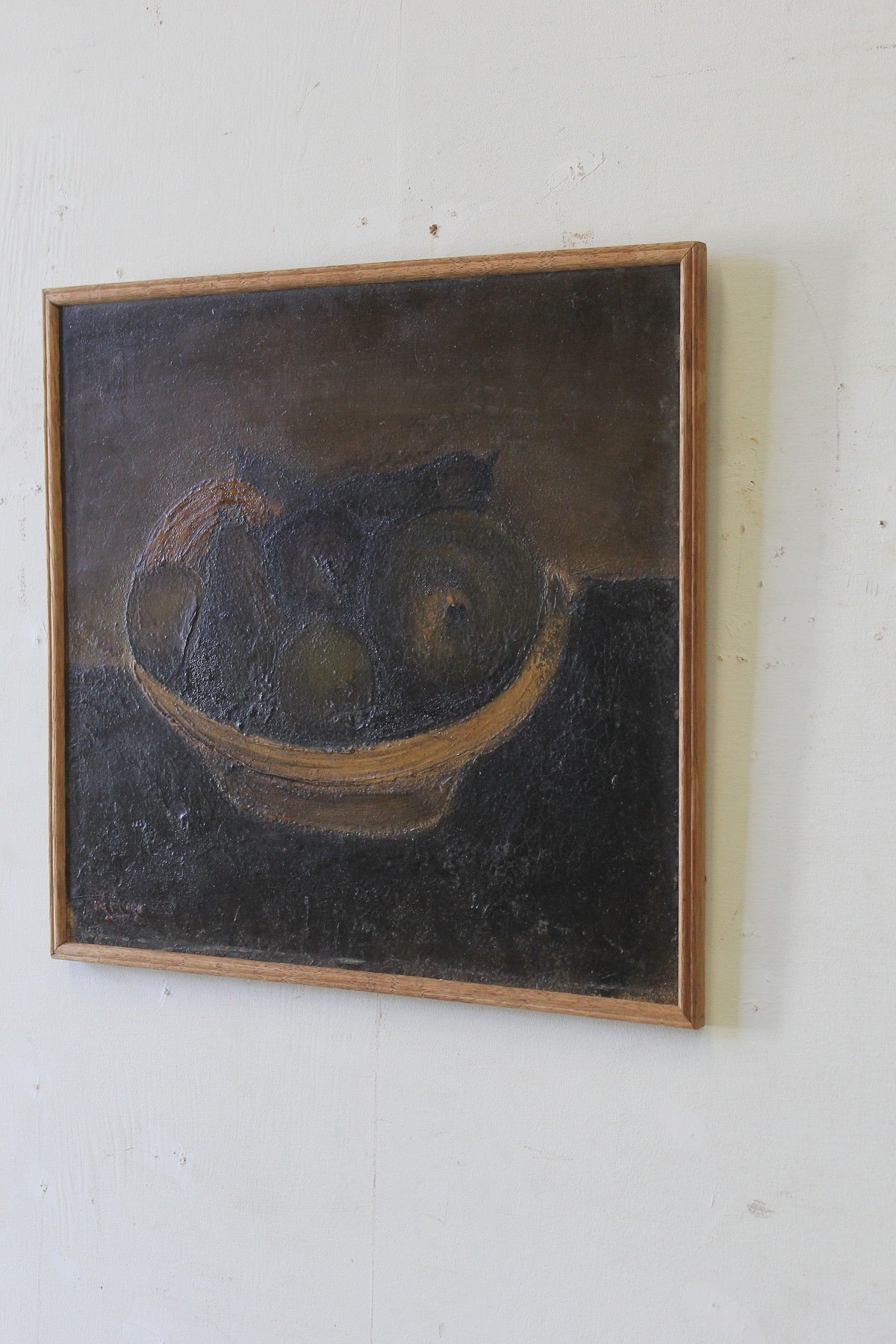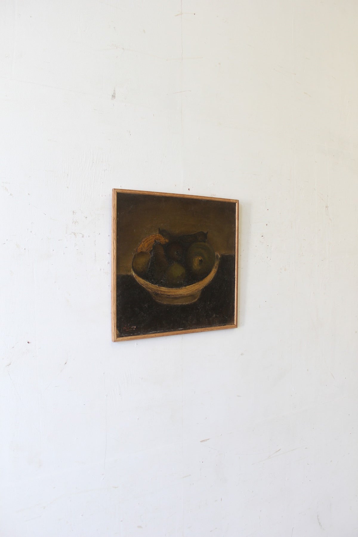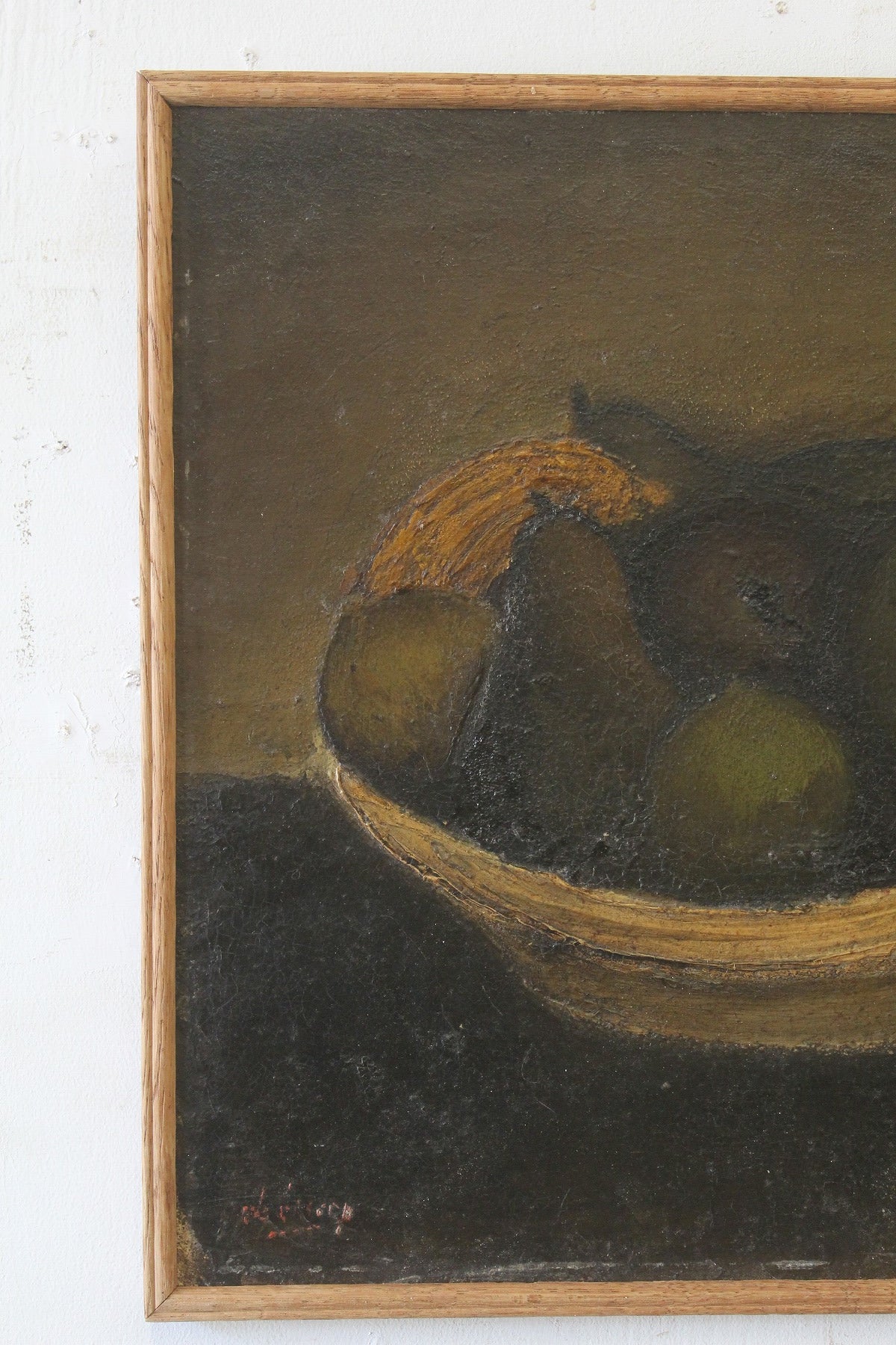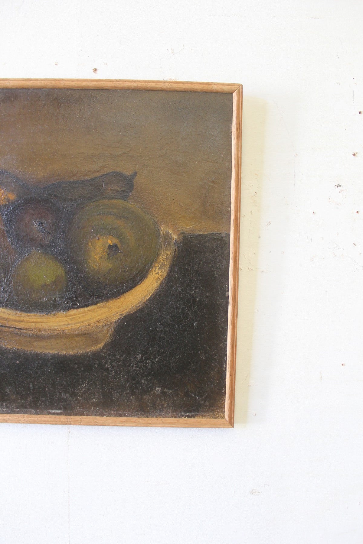 作者や詳細は不明ですが、落ち着いた色調のクラシックな静物画。古い絵ならではの絵肌のひび割れもあり、存在感のある静かで力強い作品です。