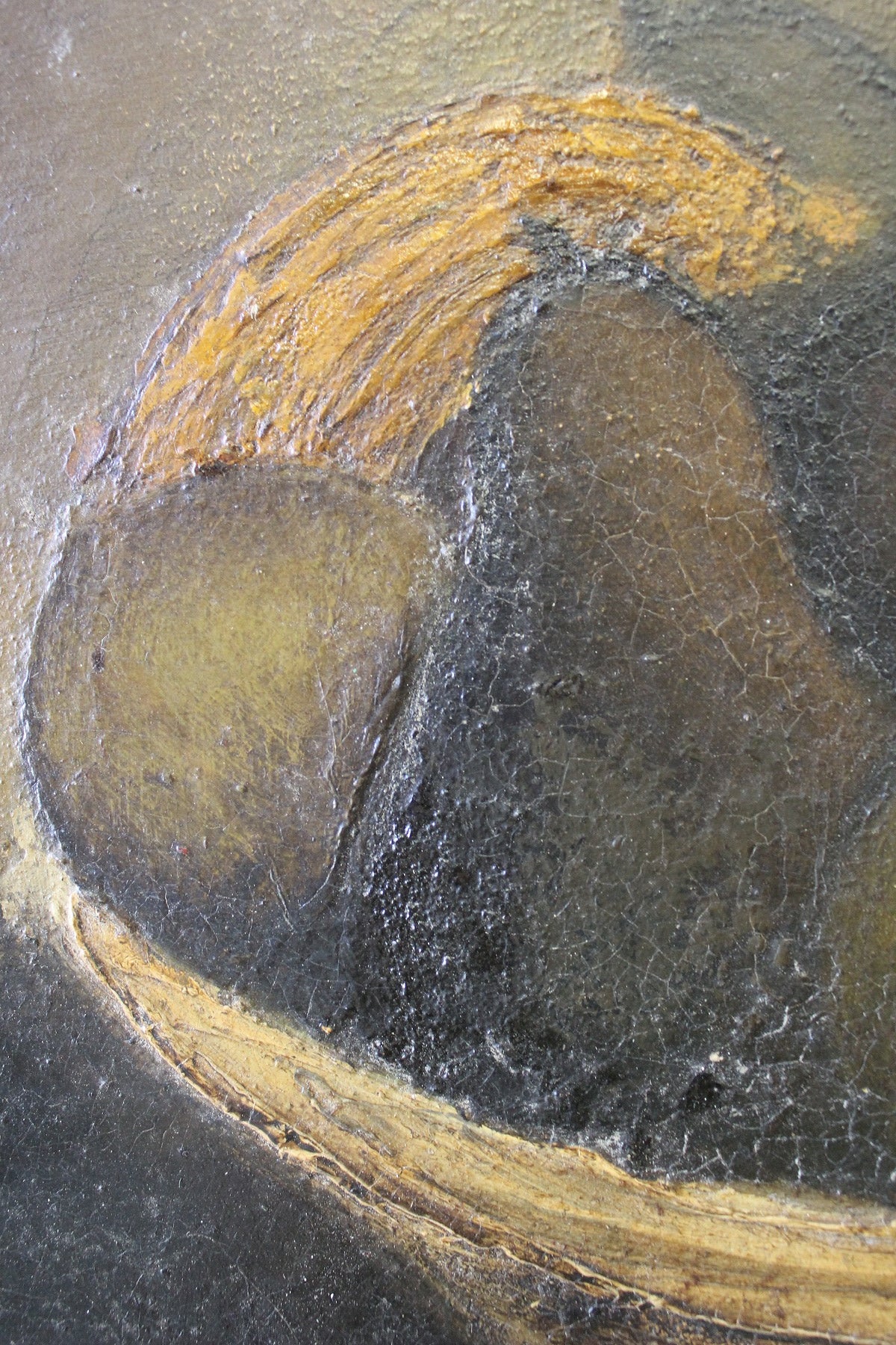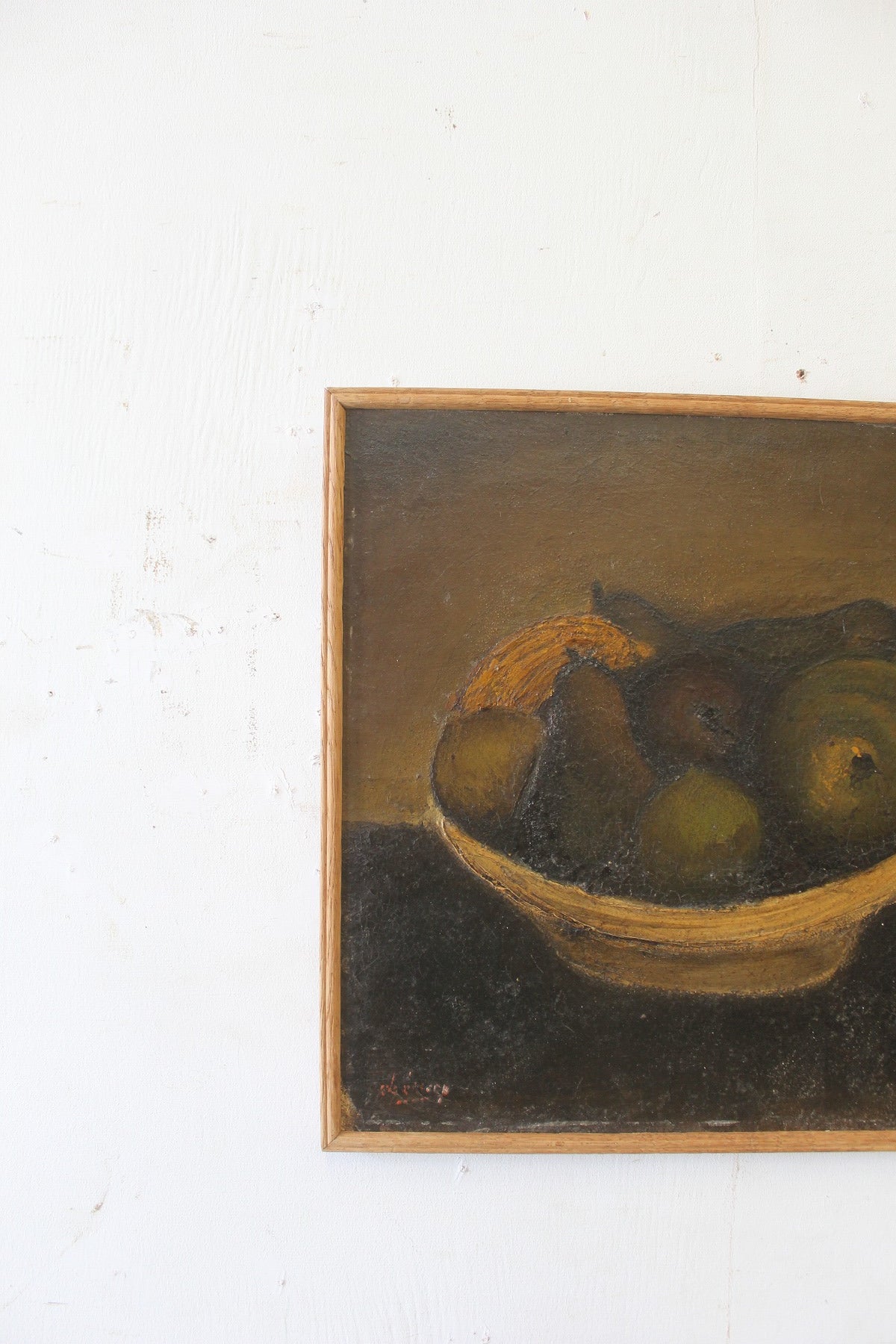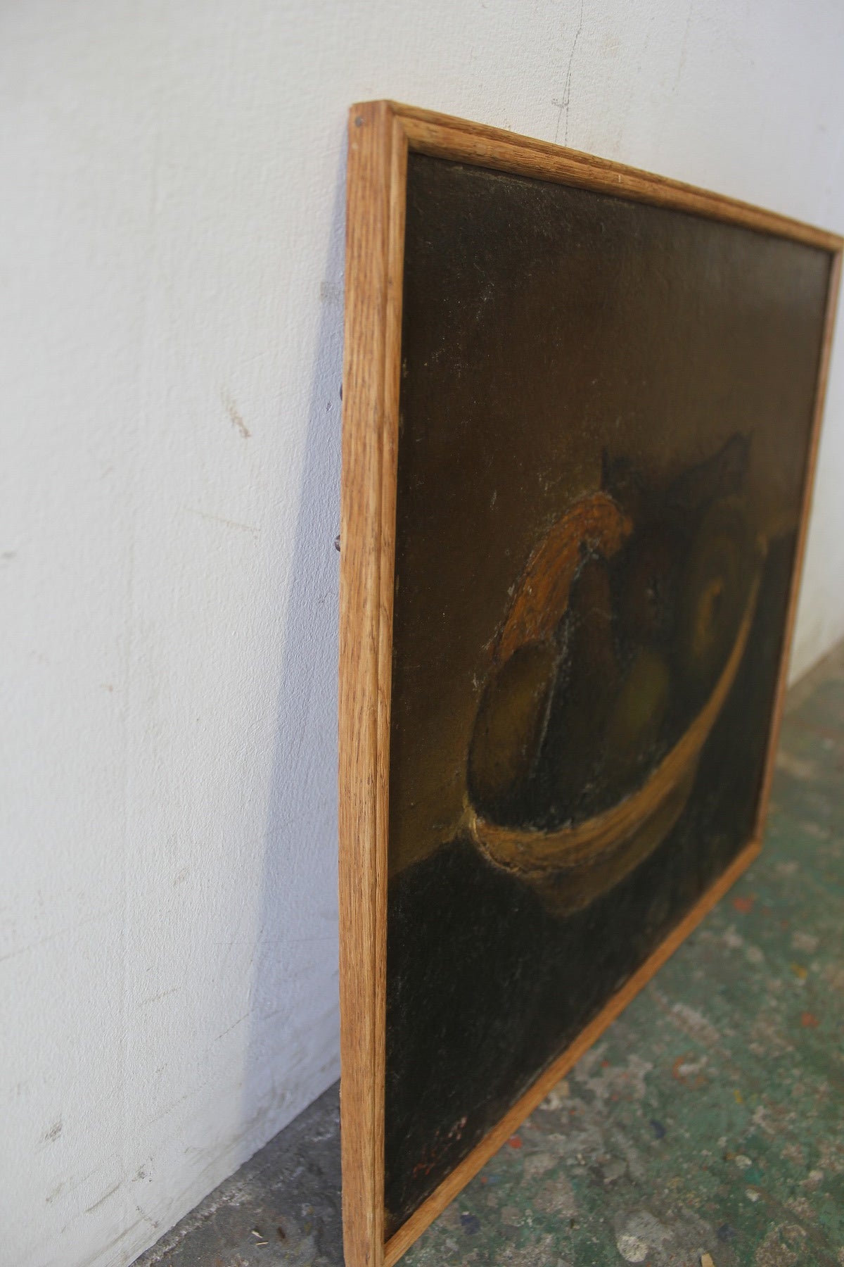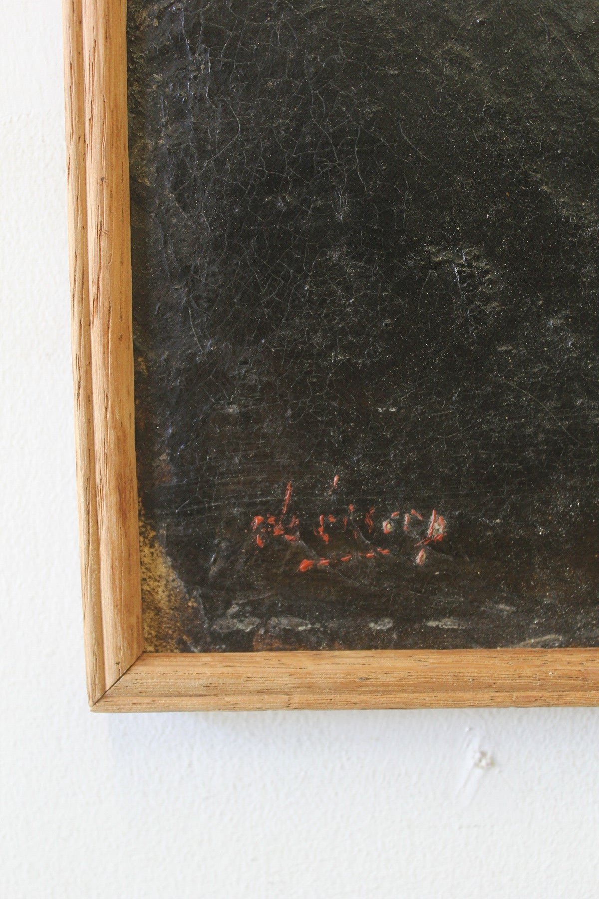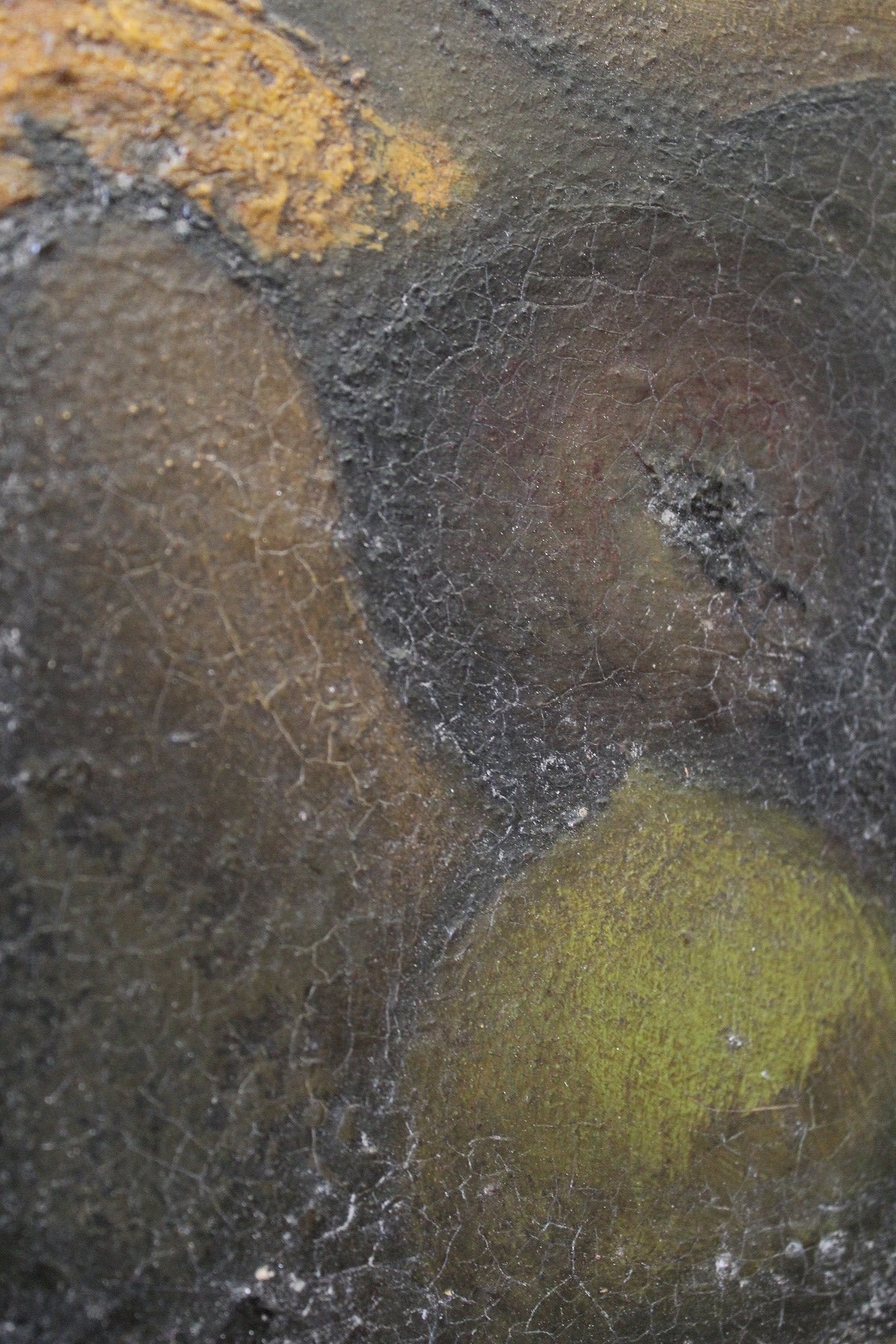 作者や詳細は不明ですが、落ち着いた色調のクラシックな静物画。古い絵ならではの絵肌のひび割れもあり、存在感のある静かで力強い作品です。