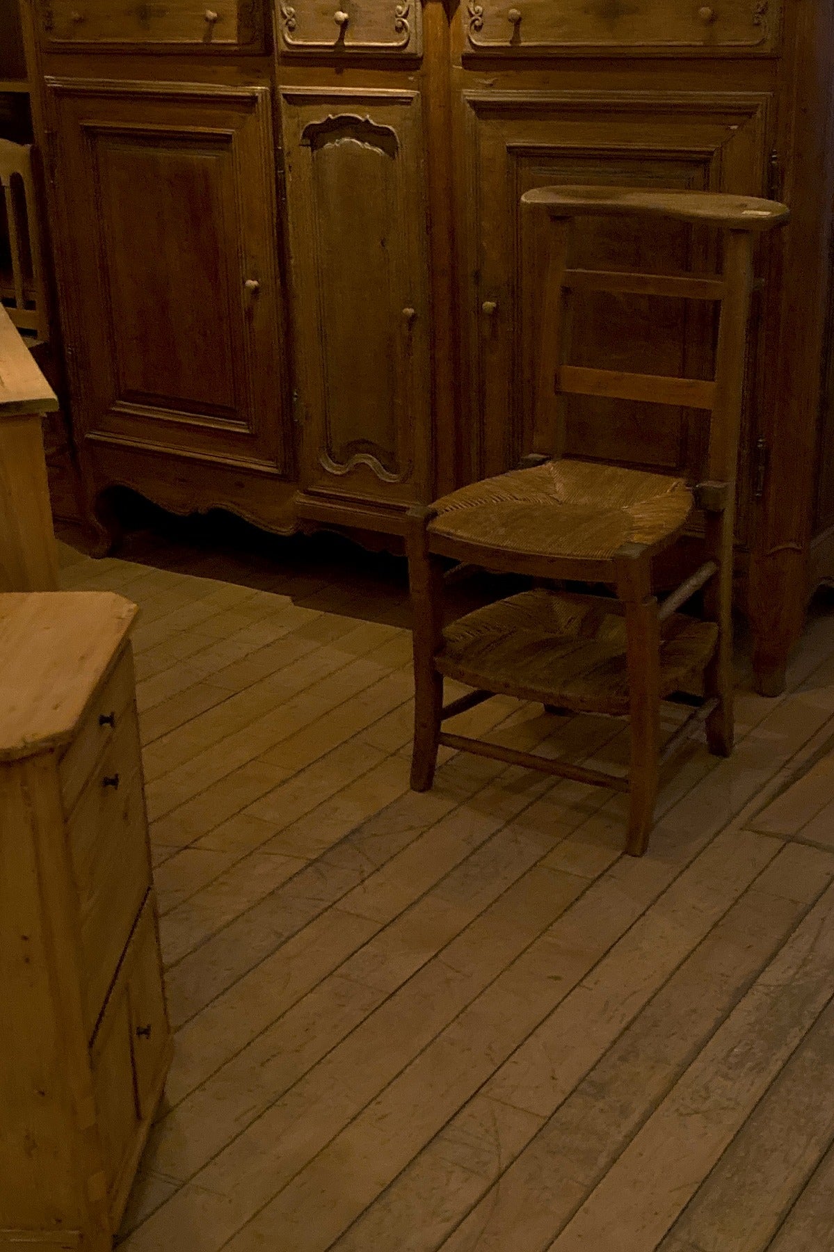 座面が立ち上がって、下段の棚に膝をつき背もたれの一番上に肘をついてお祈りをするための家具。藁の座面に使い込んだ木の風合いが絵になる椅子です。今回1脚のみの入荷です。