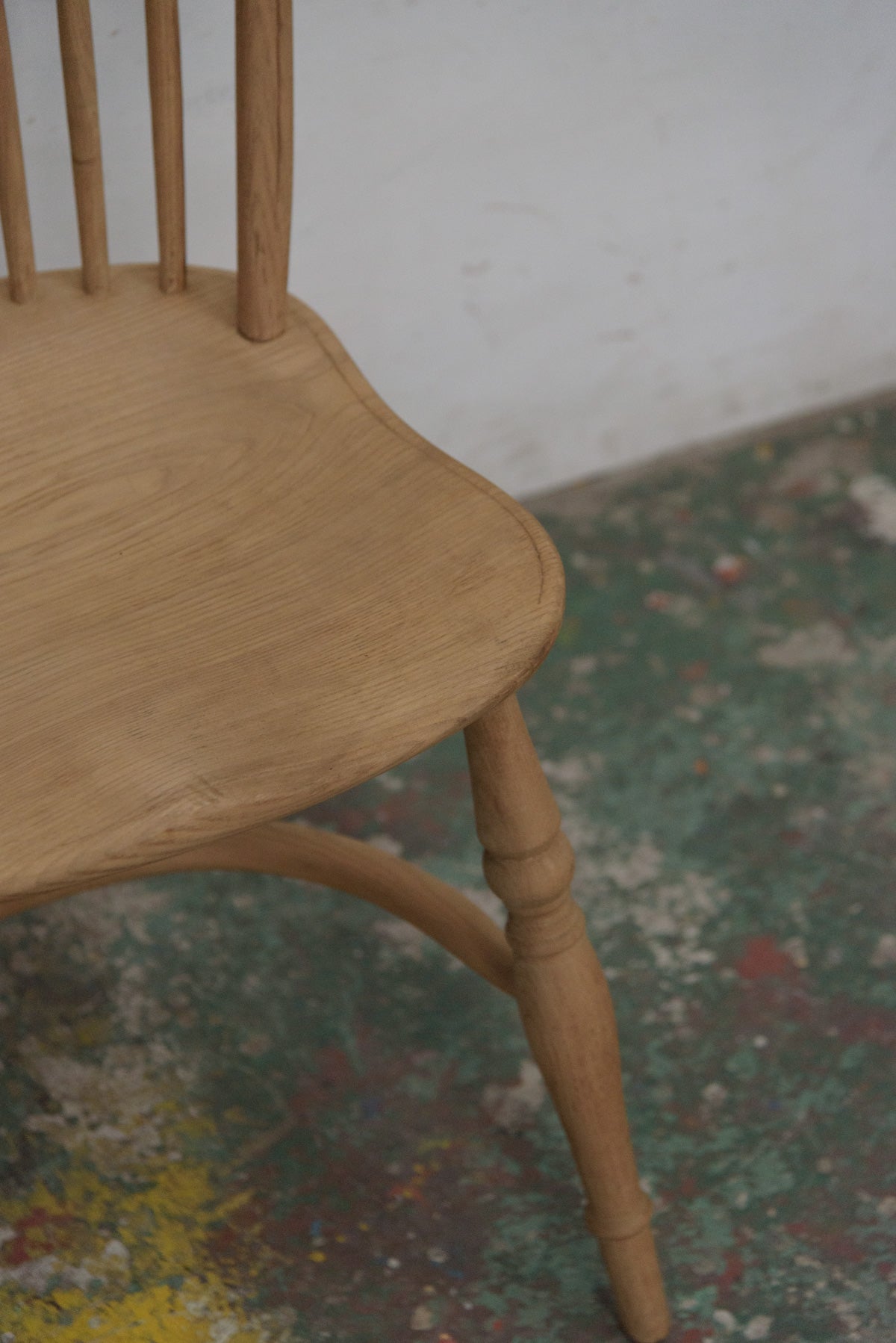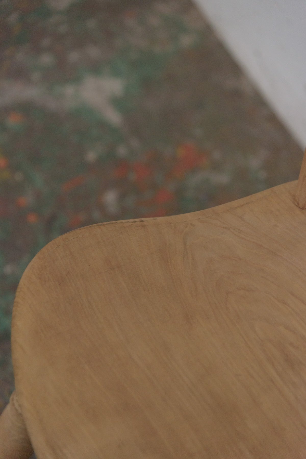 1950ー70年頃。それほど古い椅子ではありませんが、削り出された一枚板の座面にろくろ脚、カーブのかかった補強(貫)など、細部の加工に今では手に入らないこだわりの詰まった椅子です。