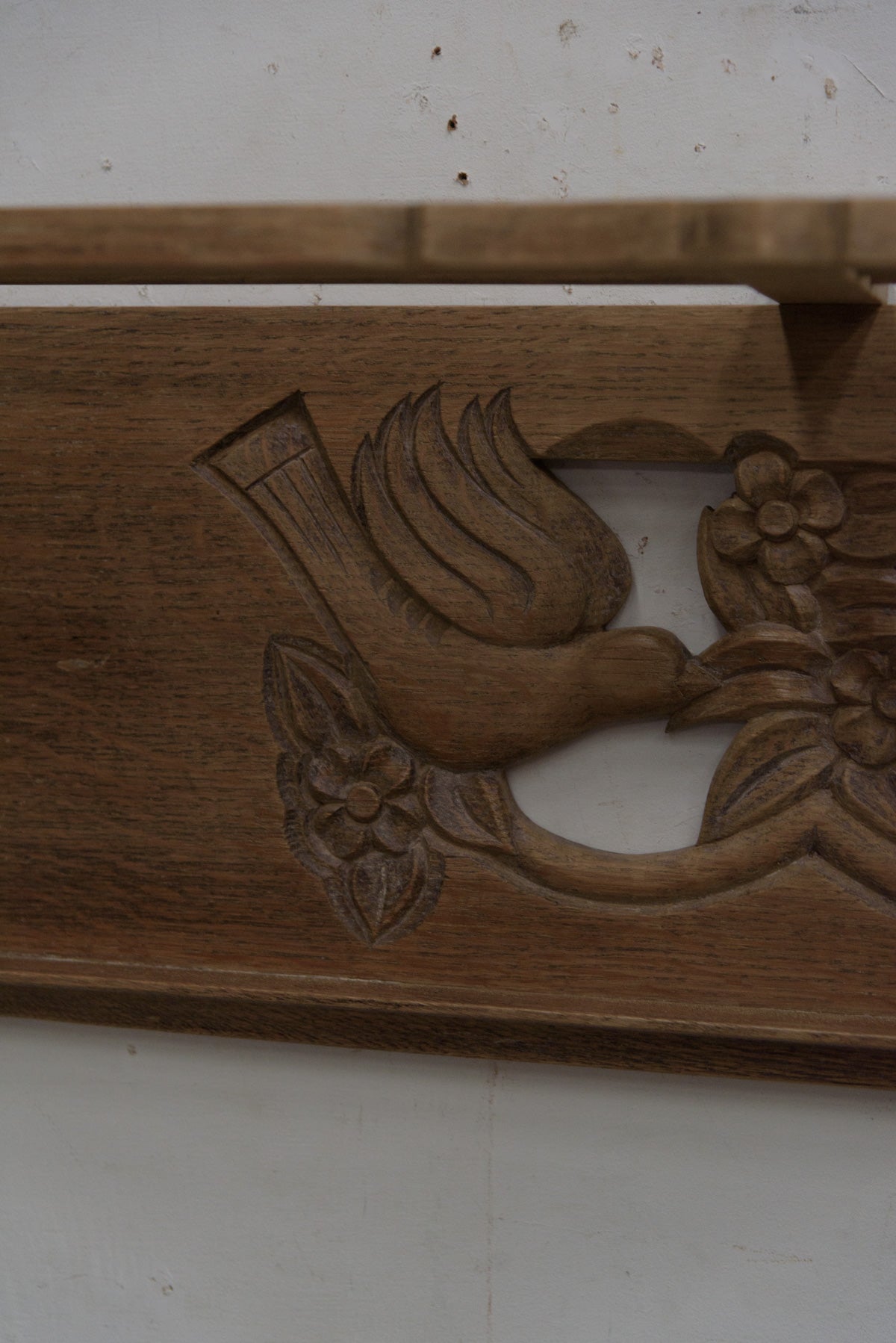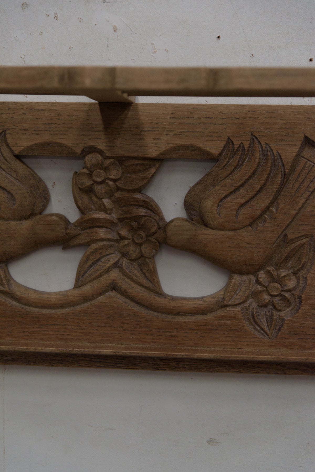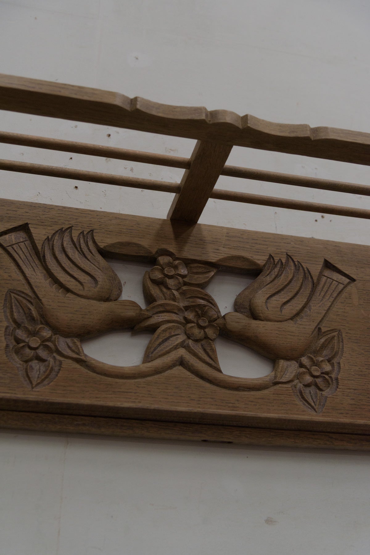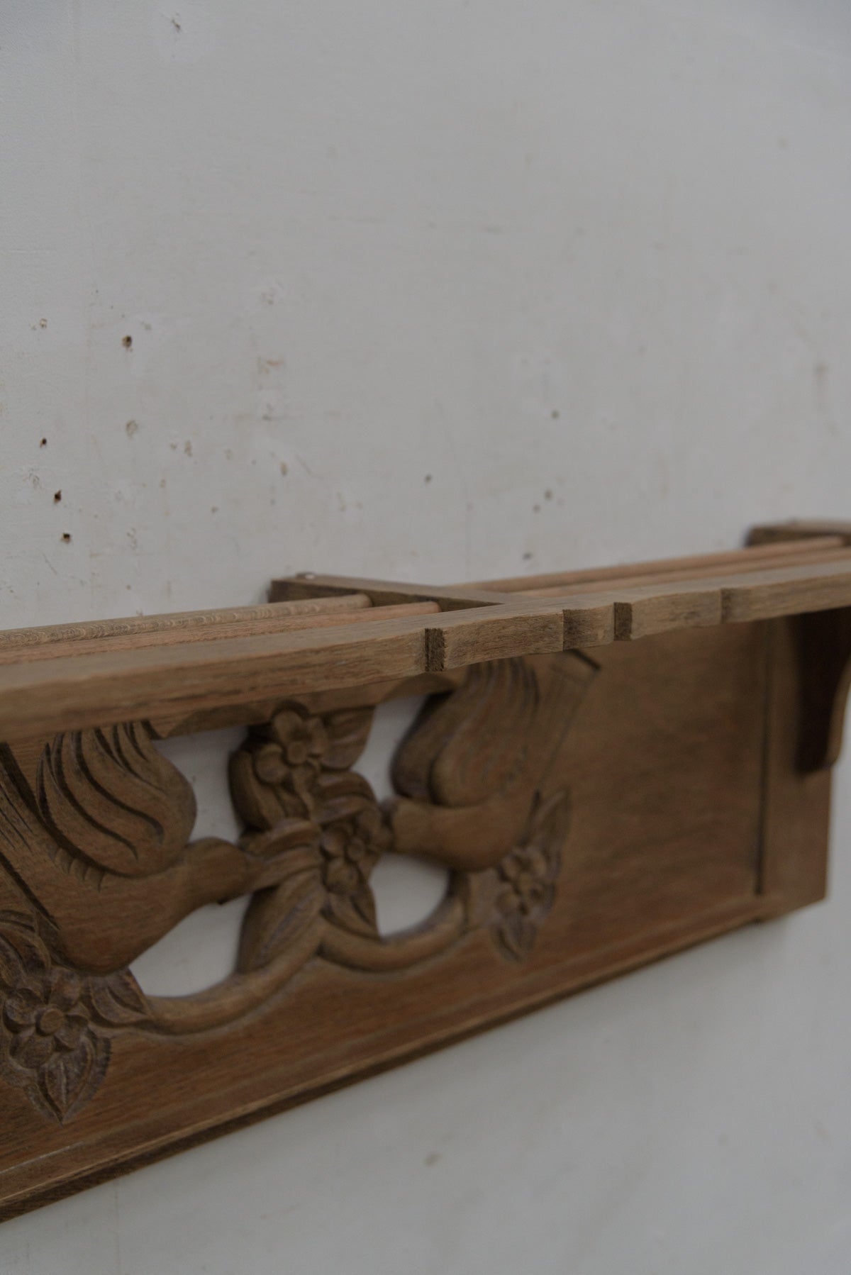 それほど古い家具ではありませんが、鳥の彫刻が魅力的で壁に取り付けると絵画のような趣があります。棚部分にものを掛けることができますので、ハンガーラック的に使うことも。材質はオーク。