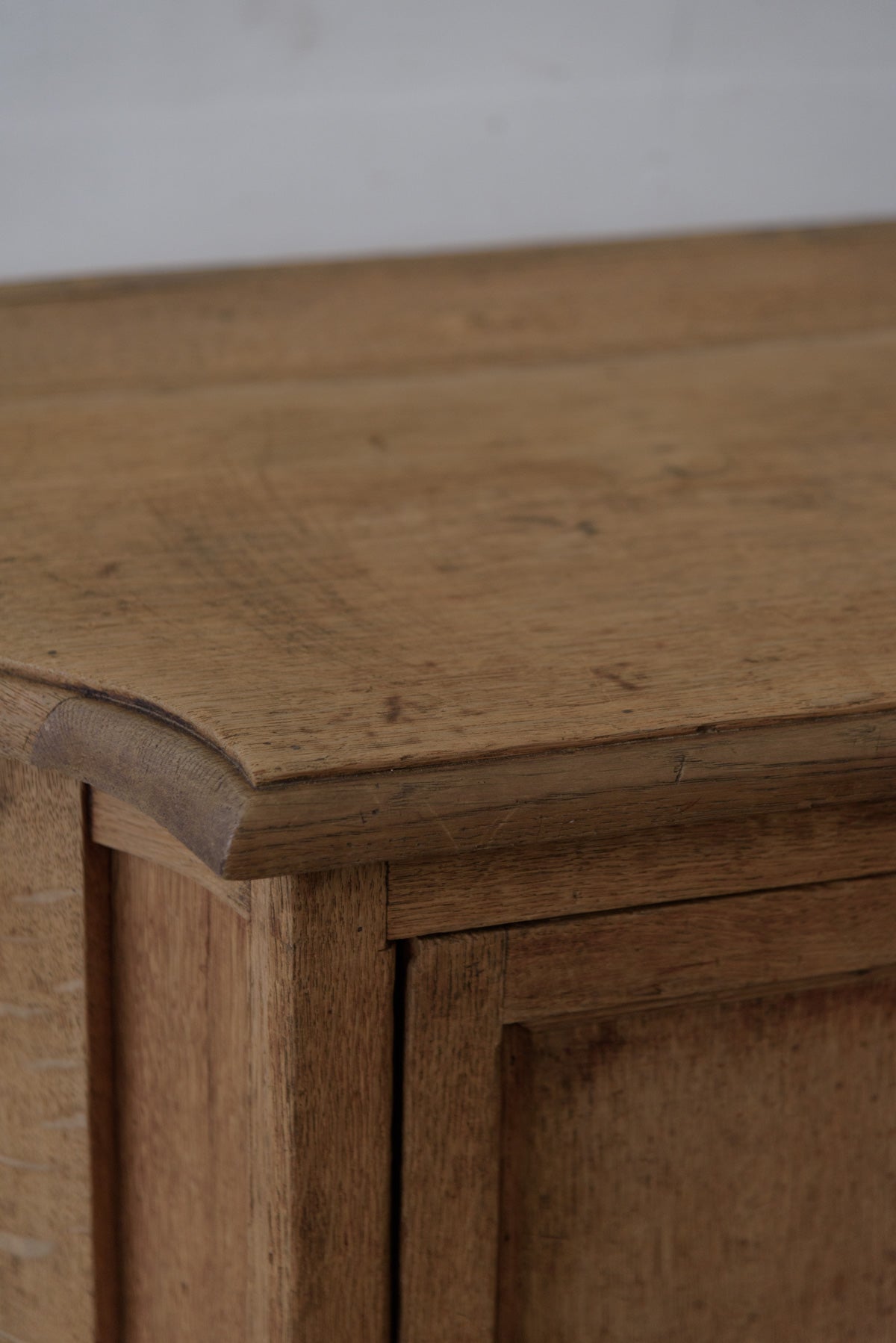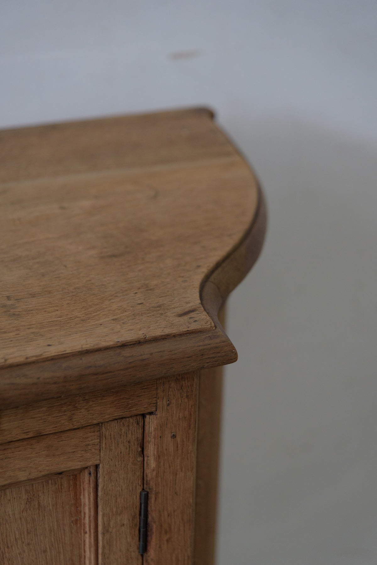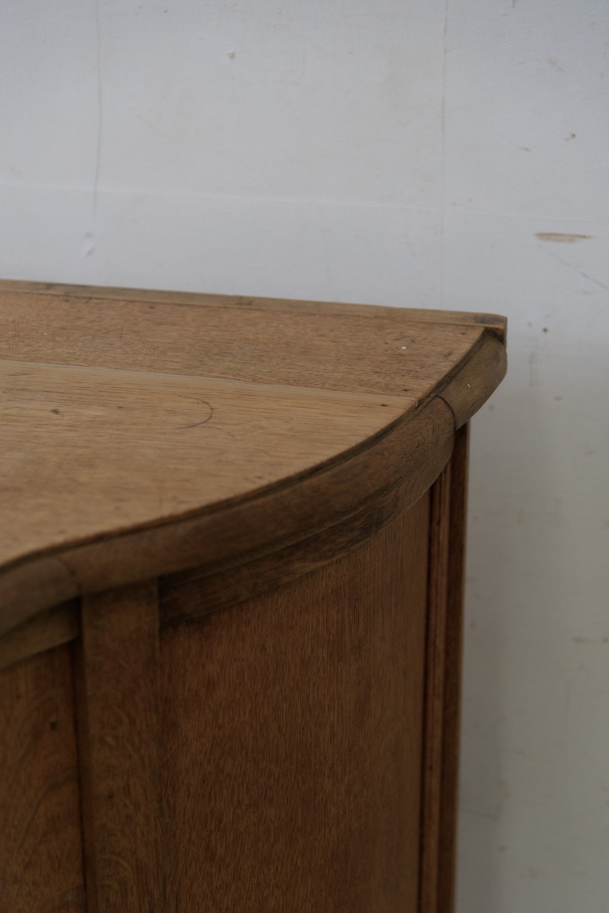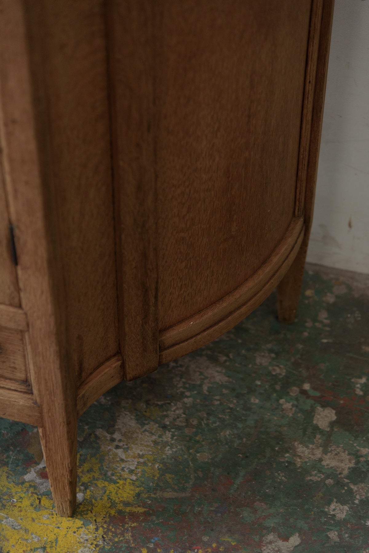 材質はオーク。カーブした側板が特徴的なめずらしいキャビネットです。扉の動きも問題なく、存在感のある家具です。棚板は固定されています。