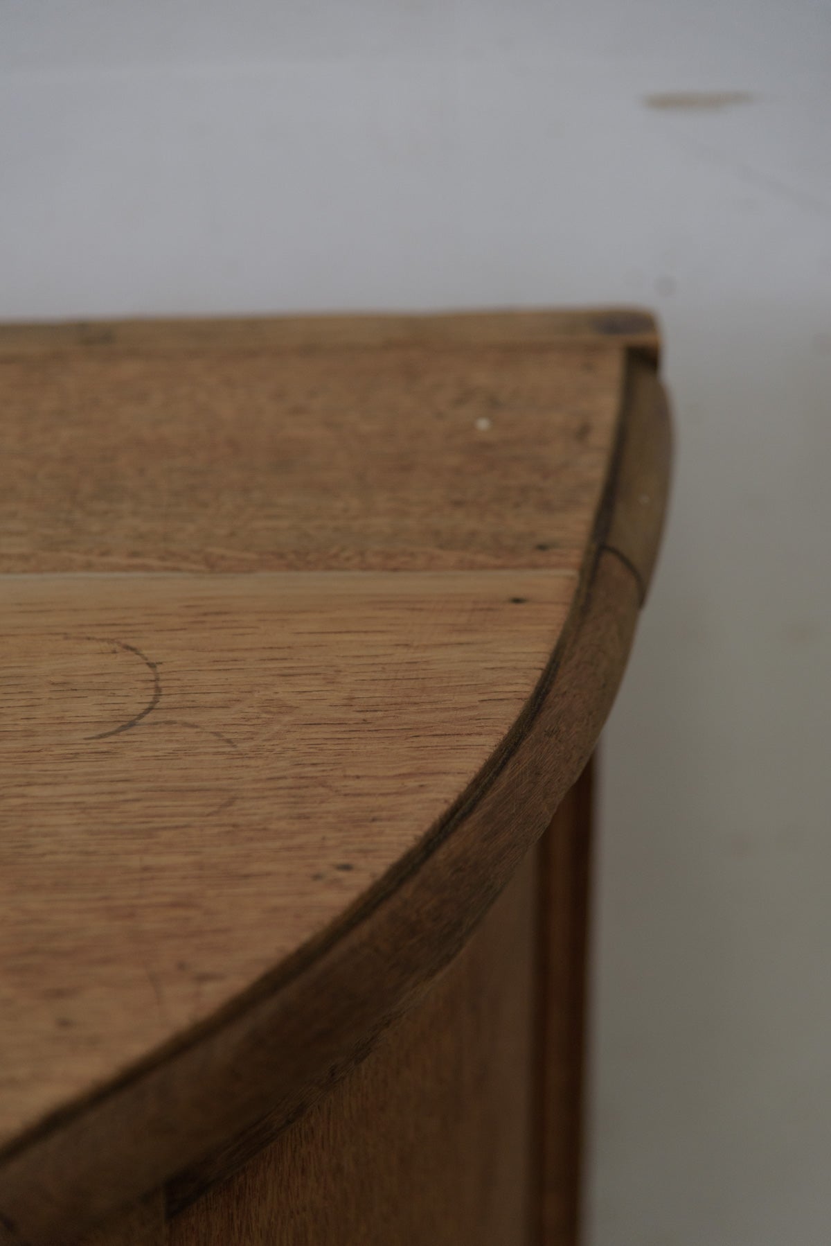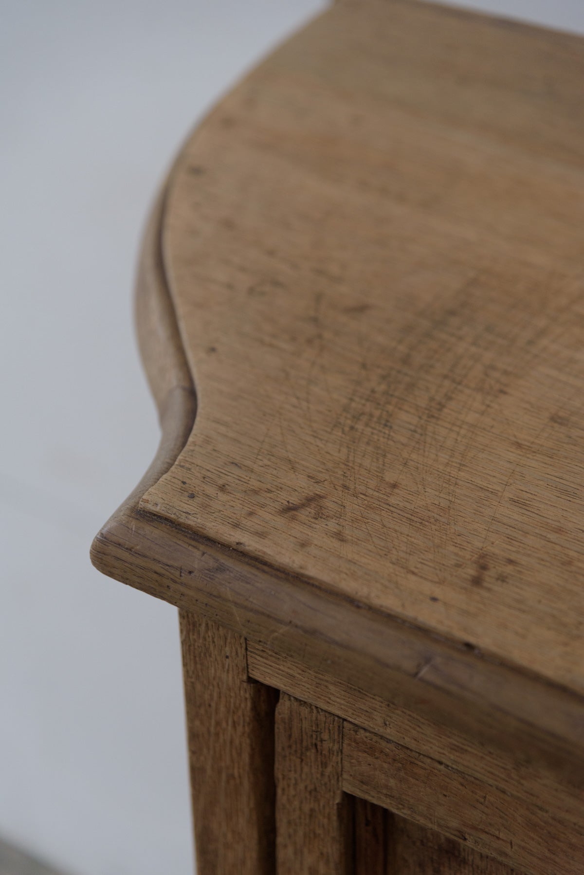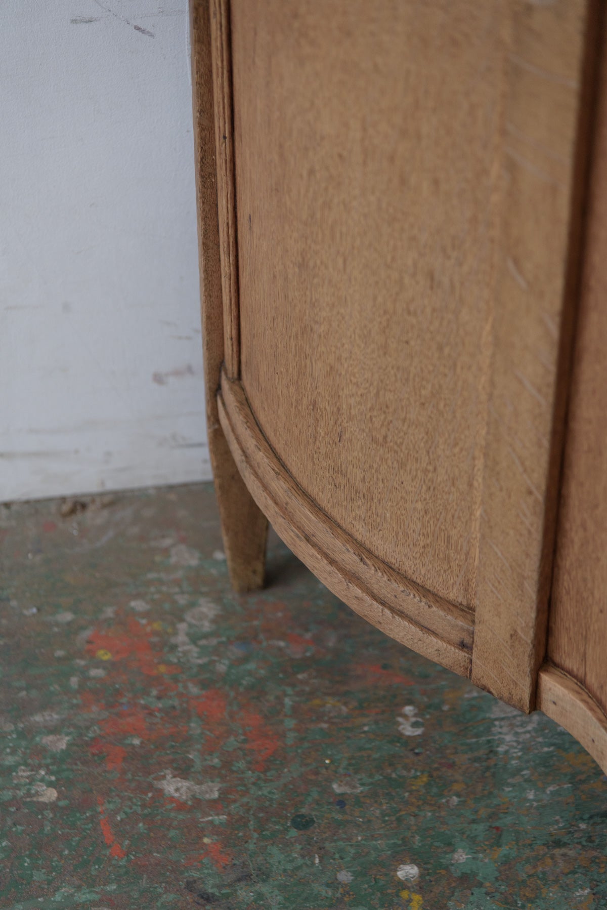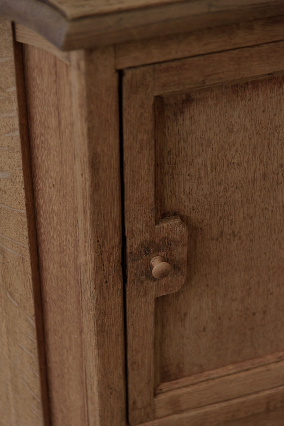 材質はオーク。カーブした側板が特徴的なめずらしいキャビネットです。扉の動きも問題なく、存在感のある家具です。棚板は固定されています。
