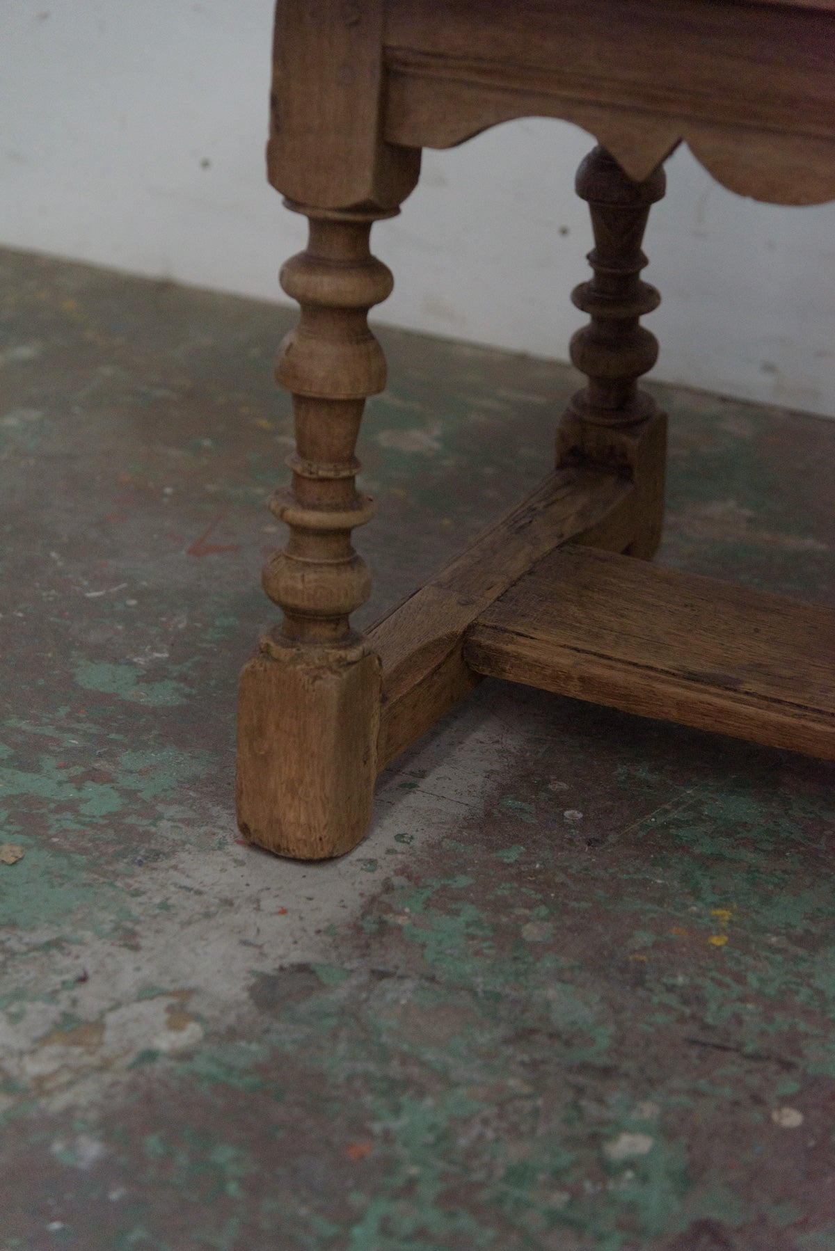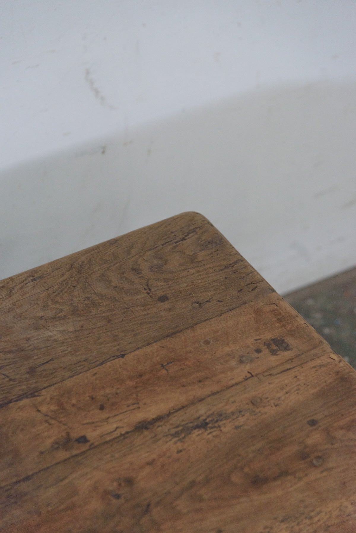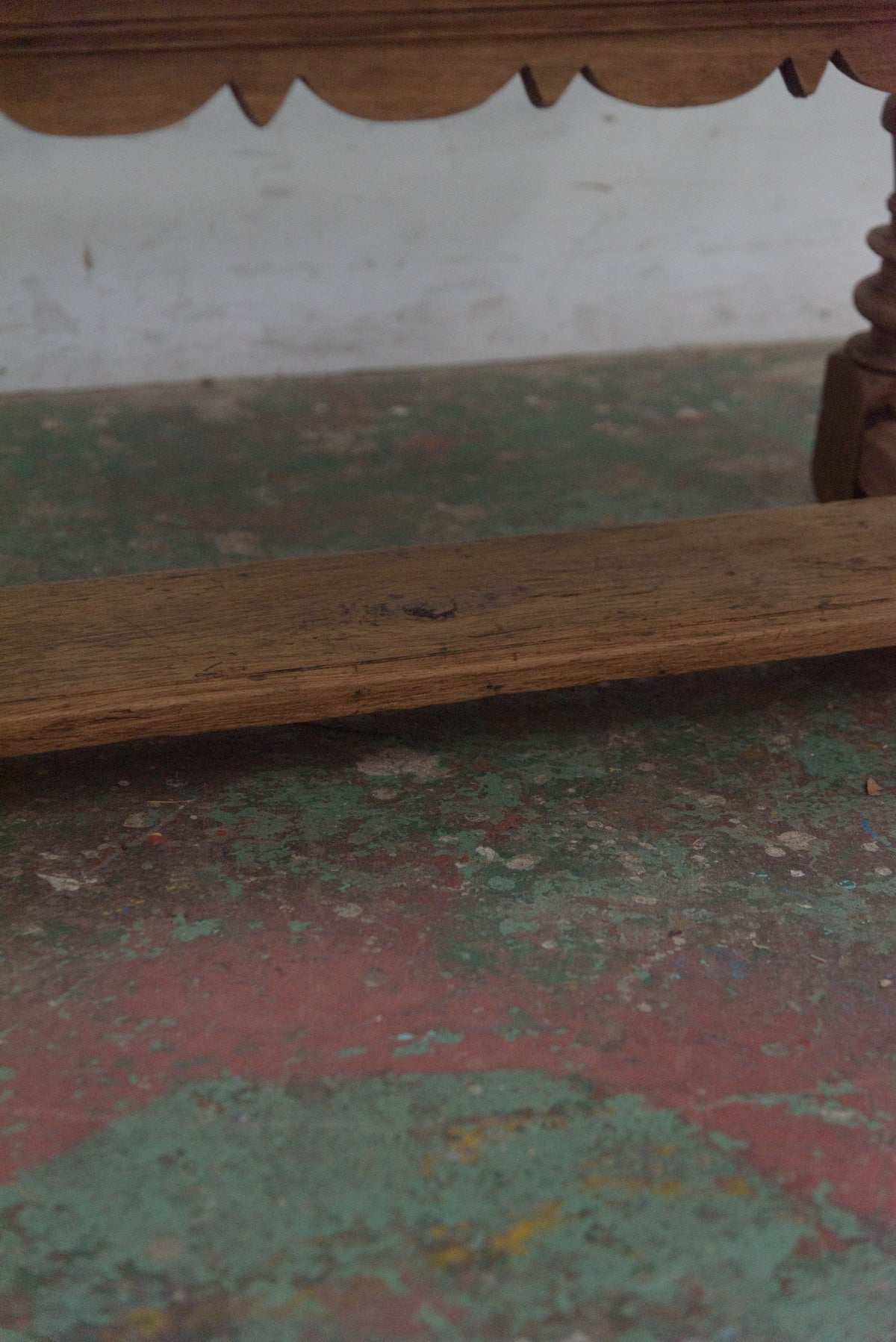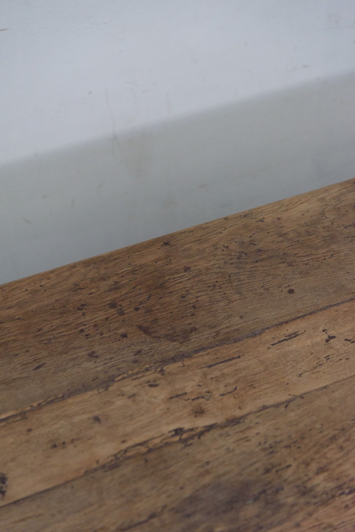 波打った装飾の幕板が印象的なアンティークテーブルです。使い込んだオーク材の天板が絵になる、存在感のある家具です。