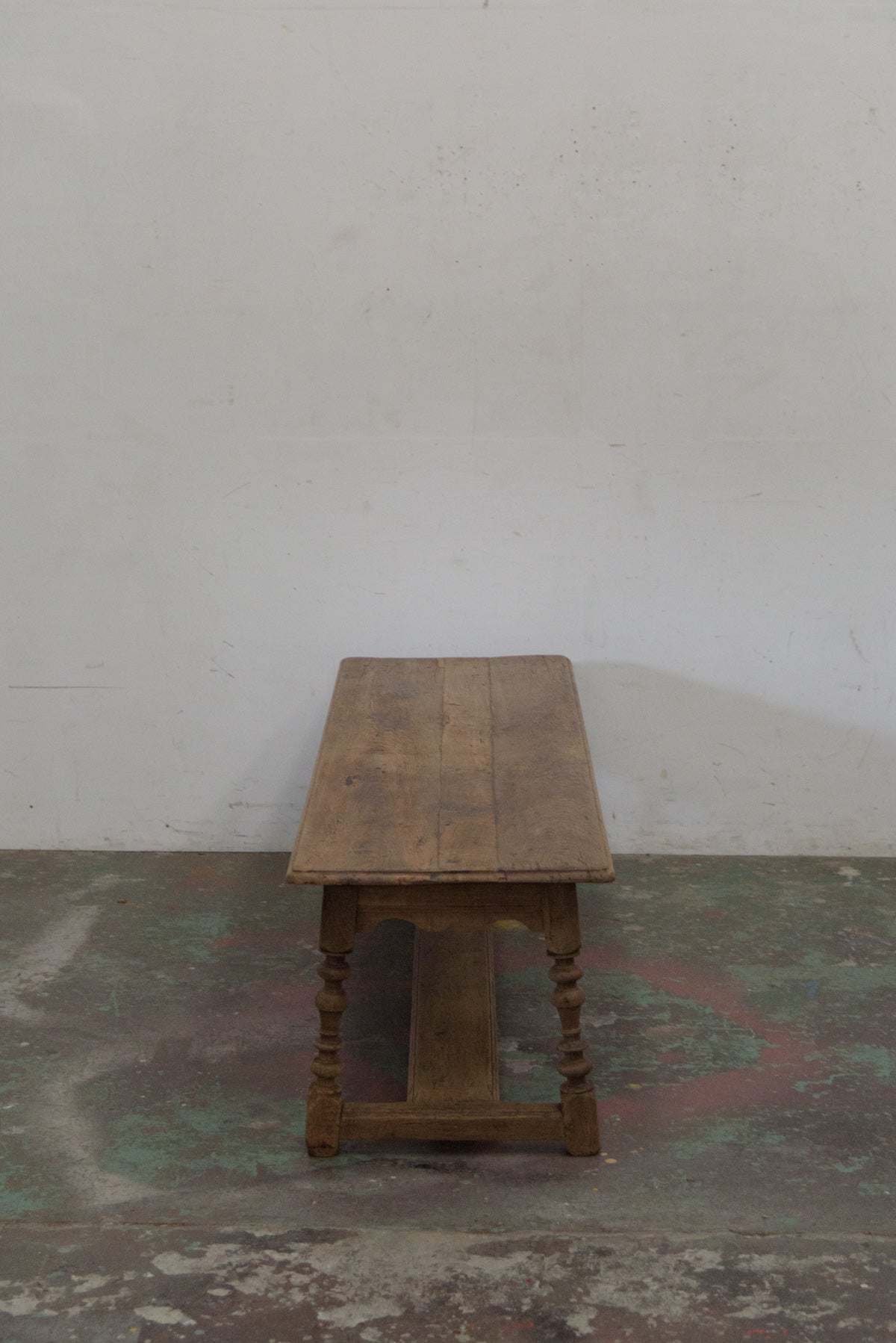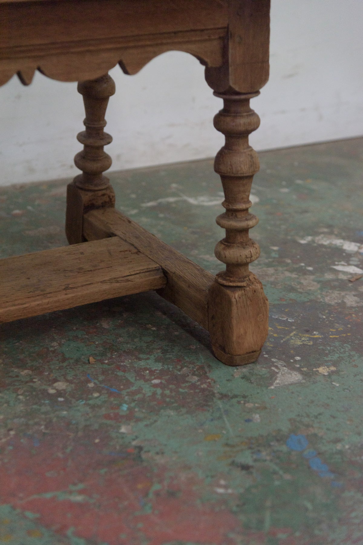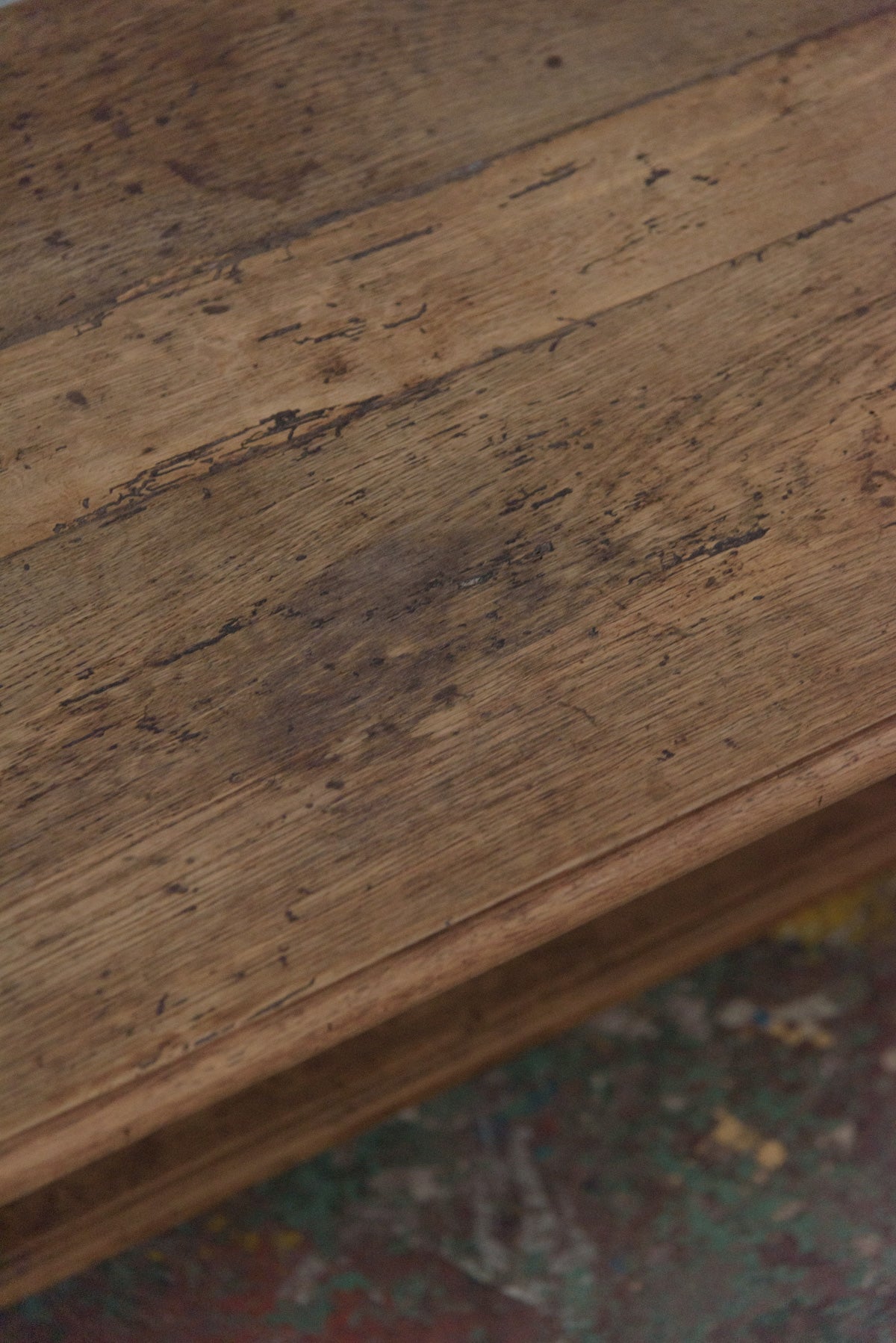 波打った装飾の幕板が印象的なアンティークテーブルです。使い込んだオーク材の天板が絵になる、存在感のある家具です。