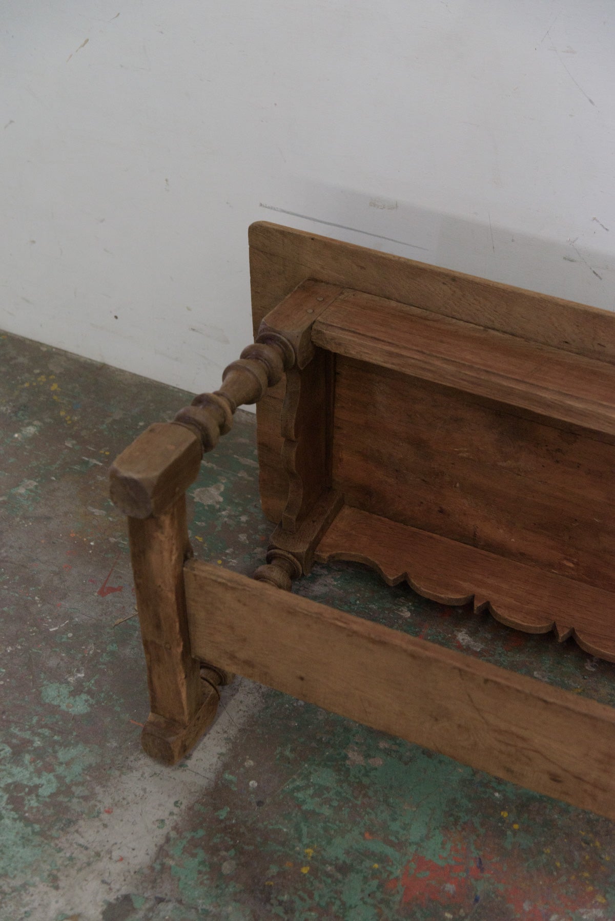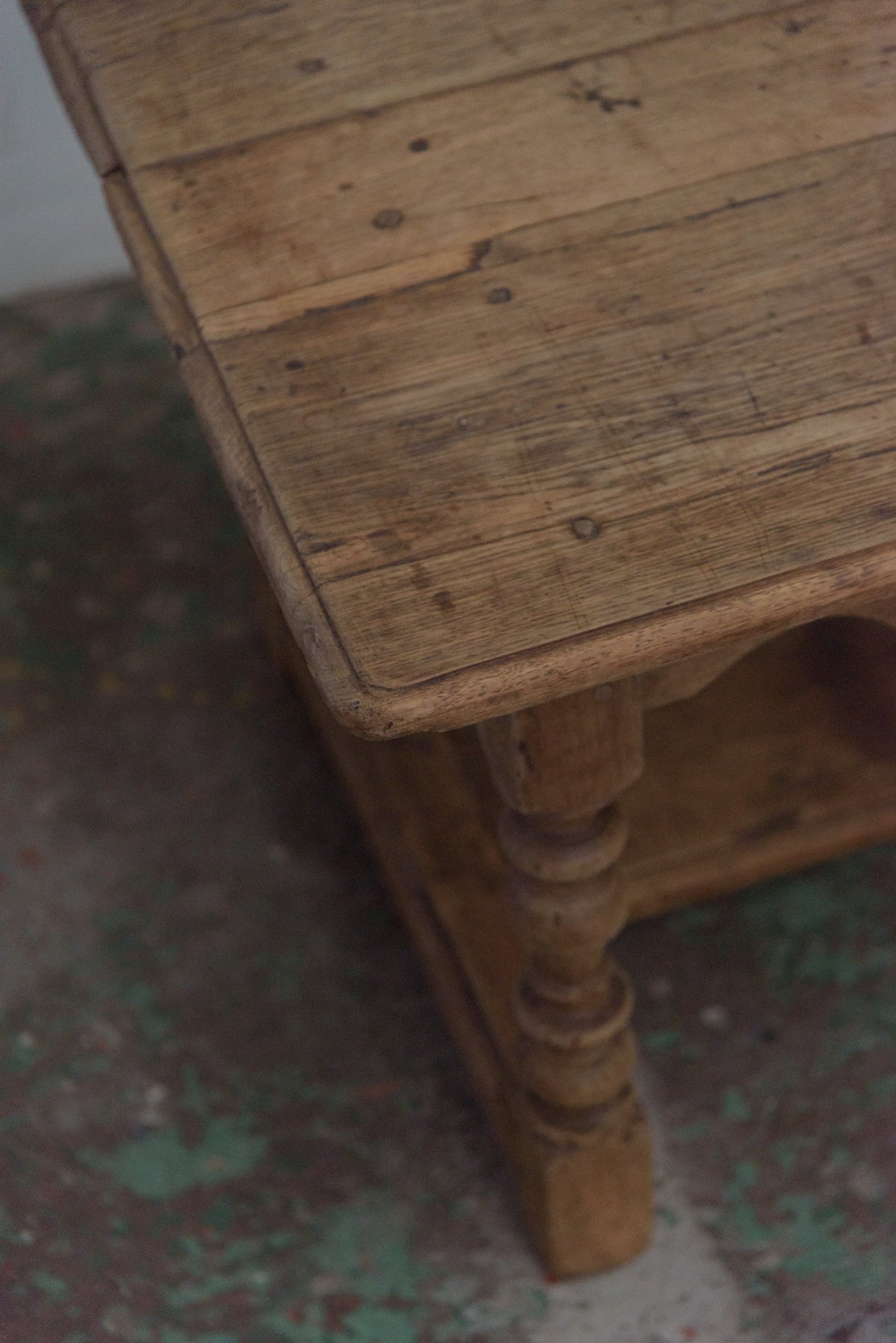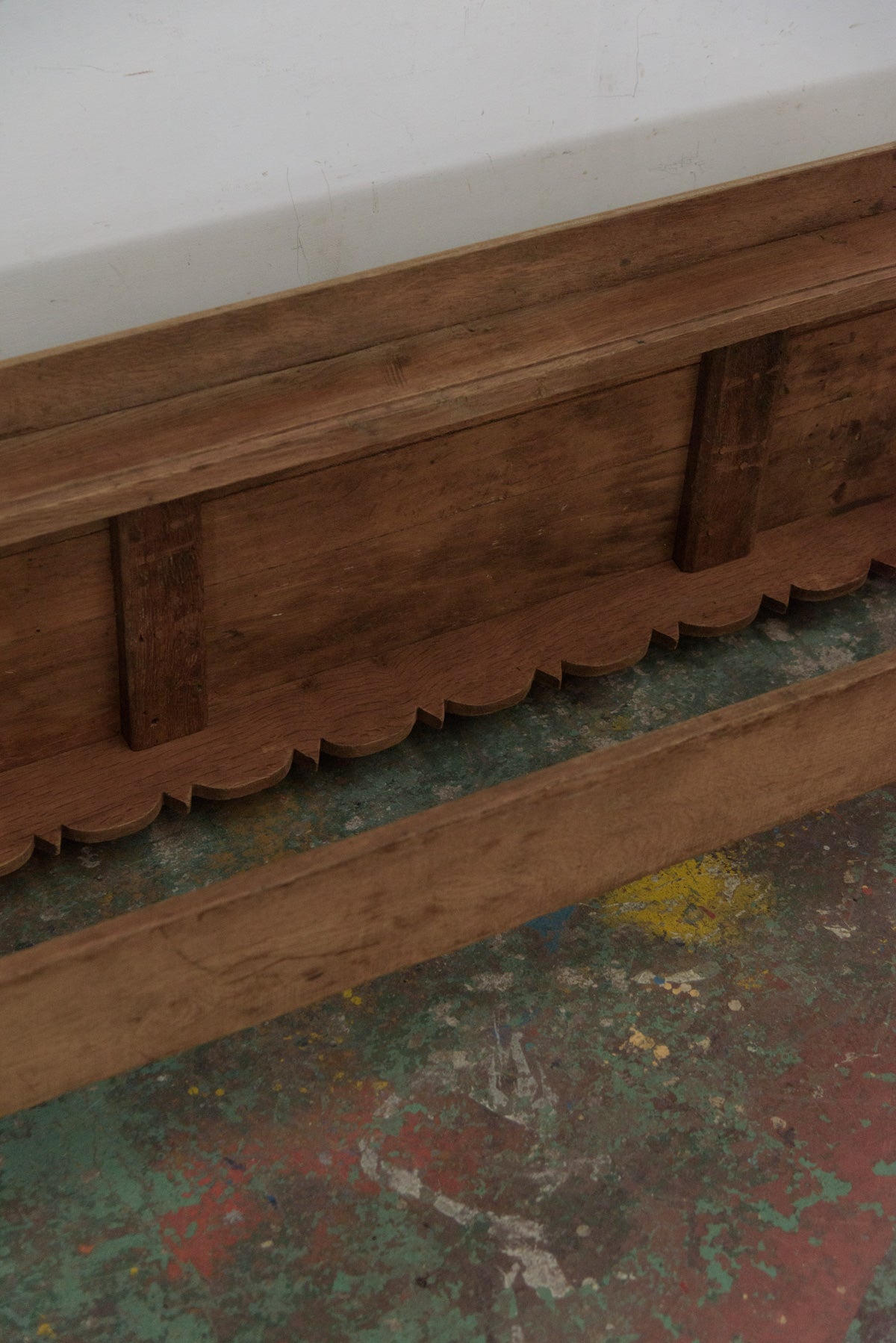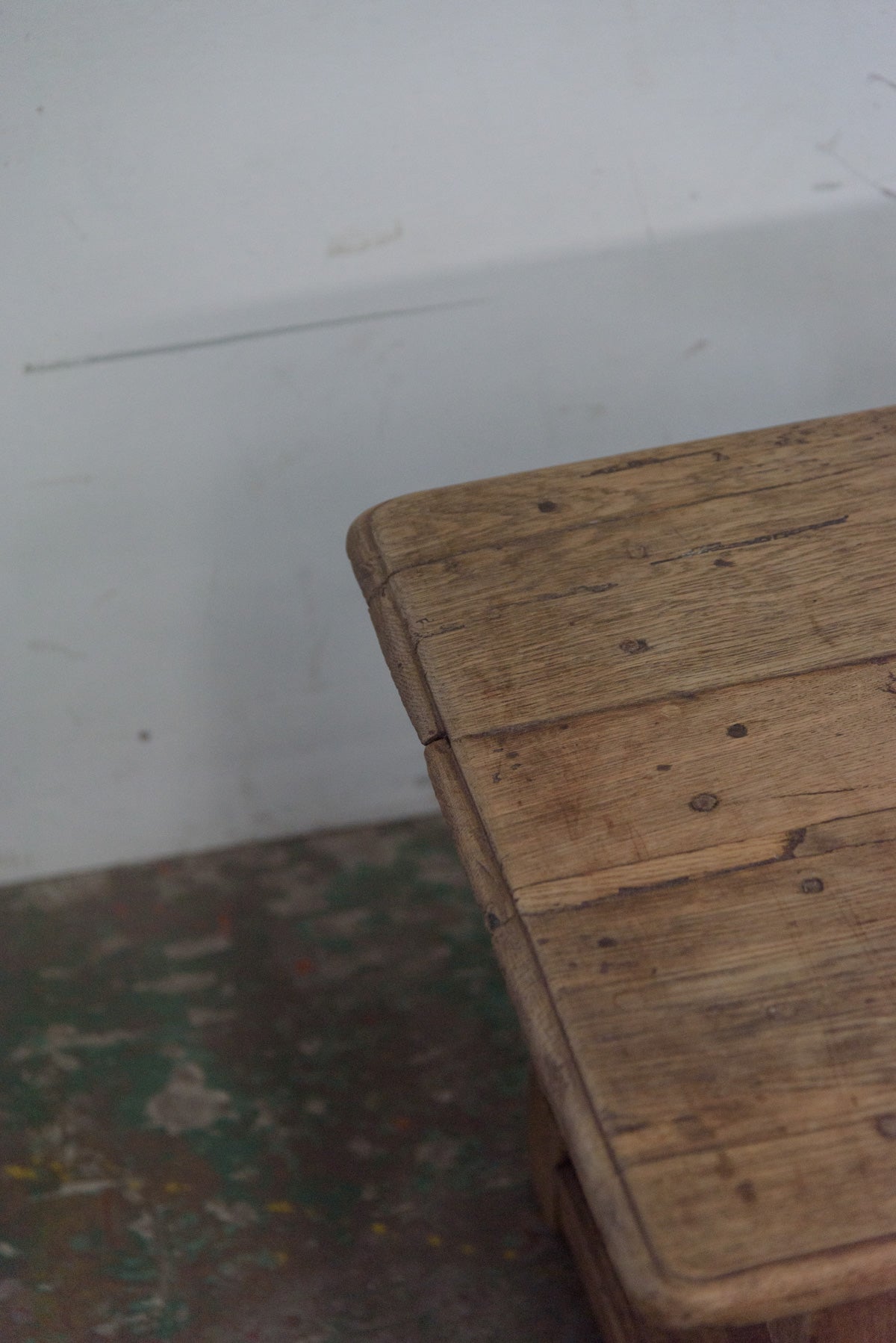 波打った装飾の幕板が印象的なアンティークテーブルです。使い込んだオーク材の天板が絵になる、存在感のある家具です。