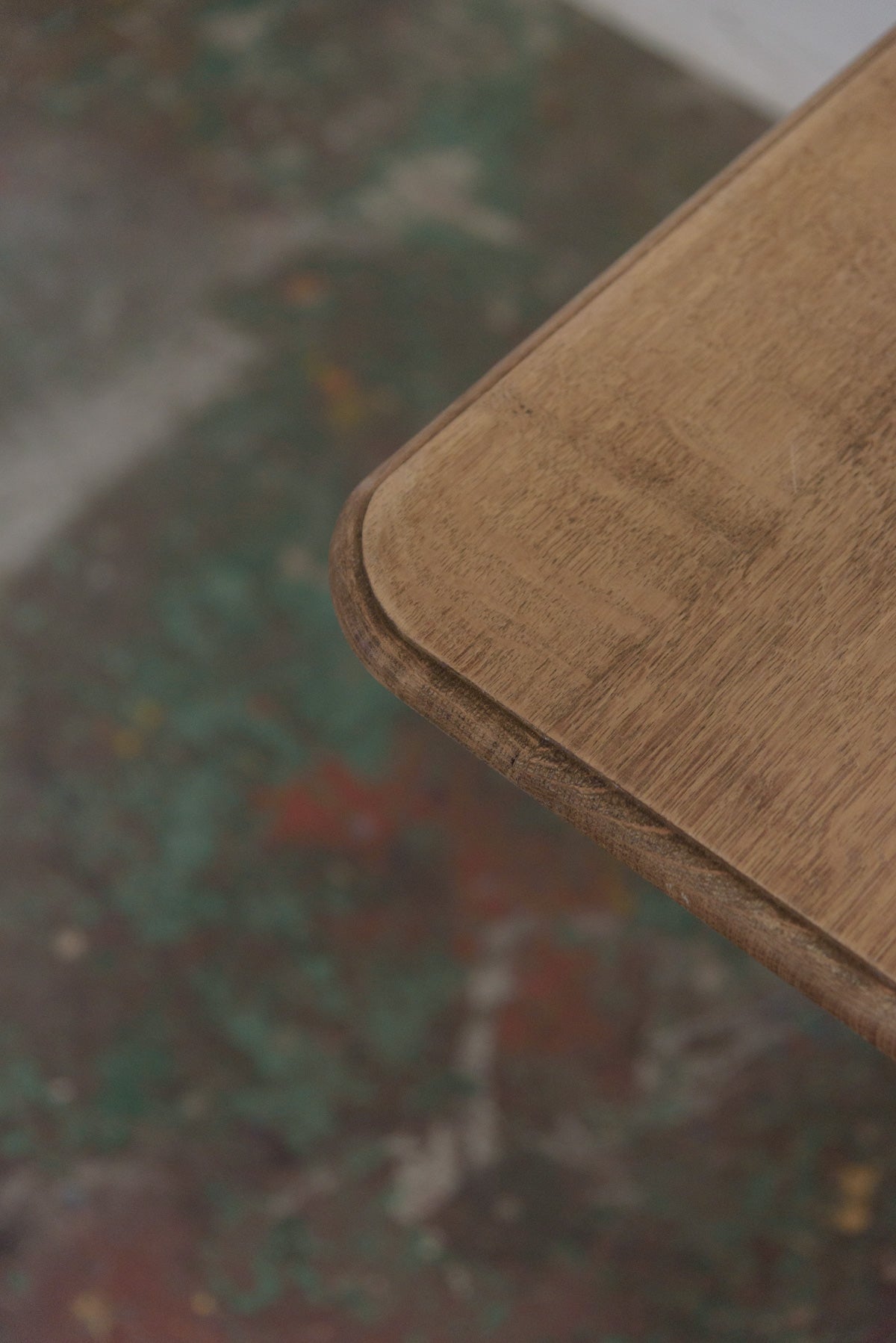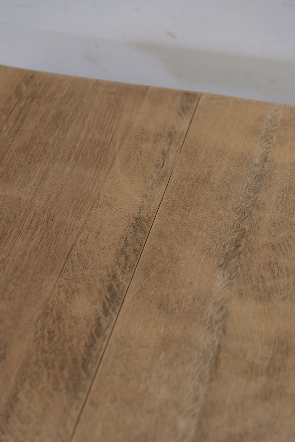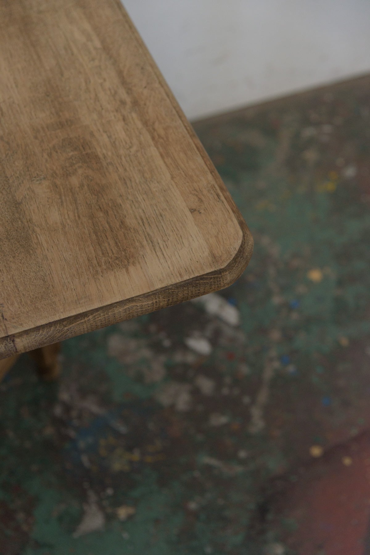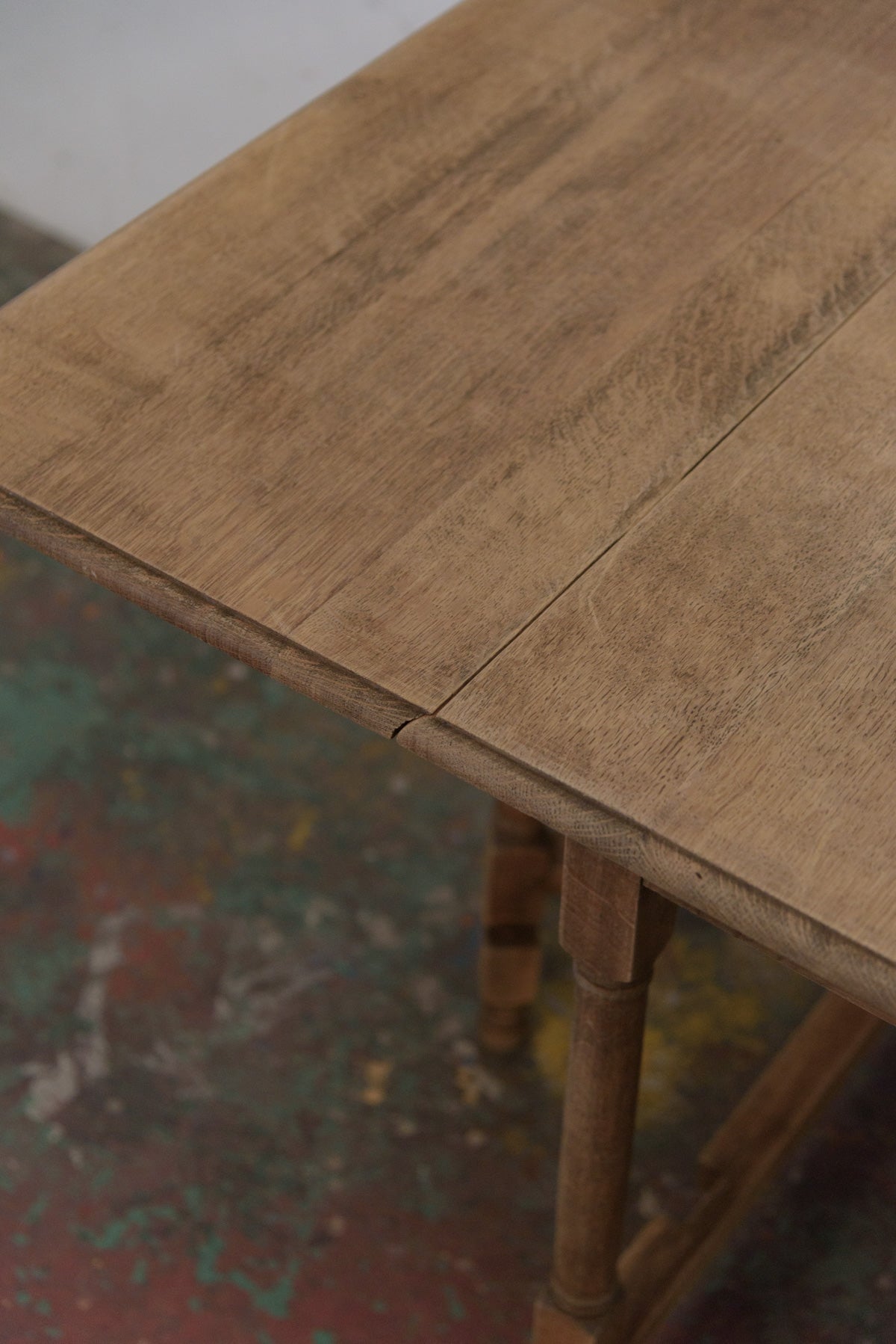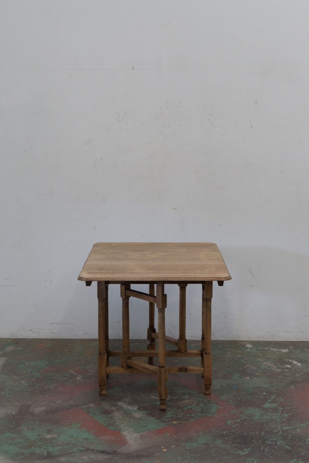 門のような脚が左右に開くことで天板が大きくなる構造です。オーク材の質感の良いアンティークテーブルです。このてのテーブルは丸い天板のものが多い中、こちらはレアで小さめの四角天板になります。