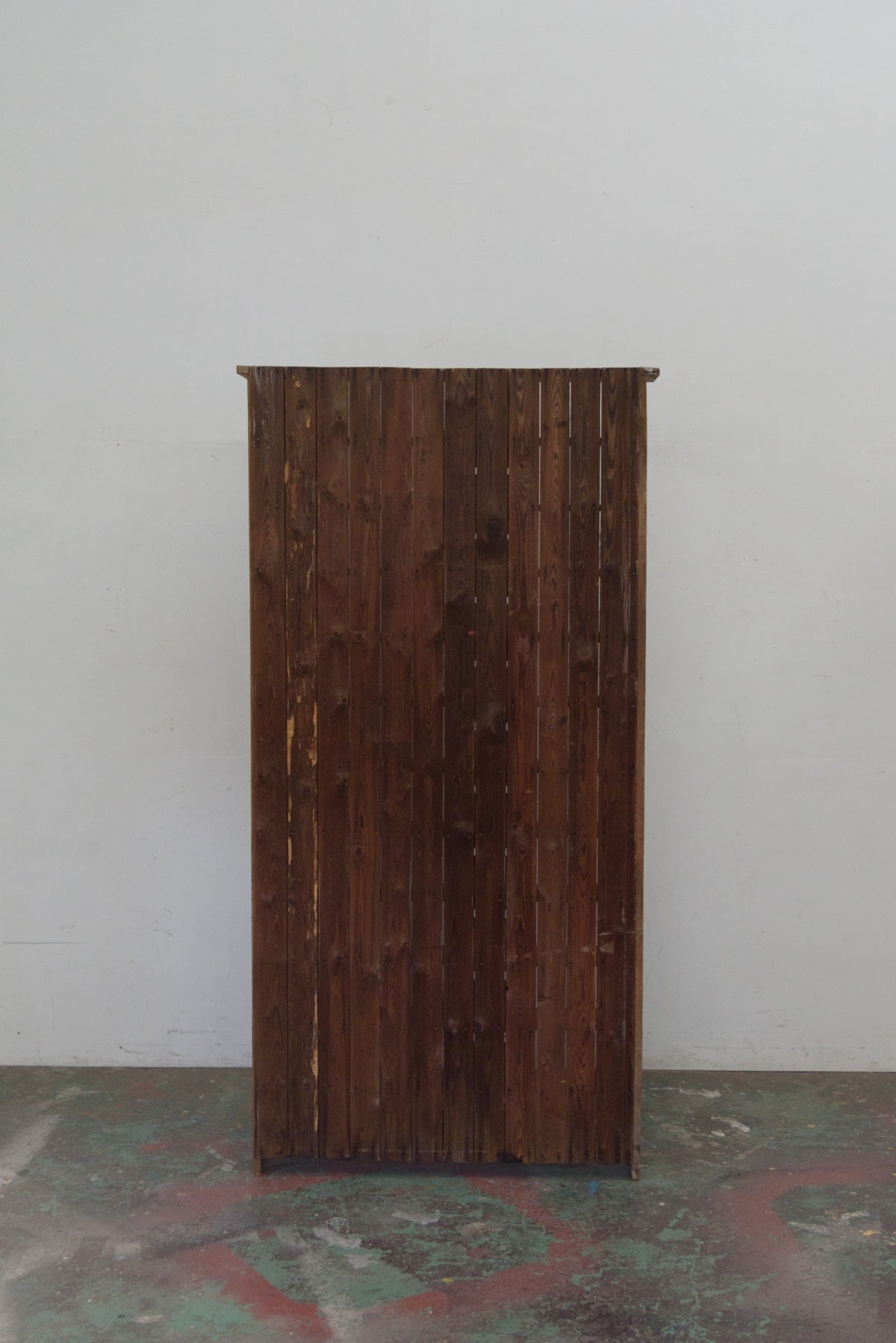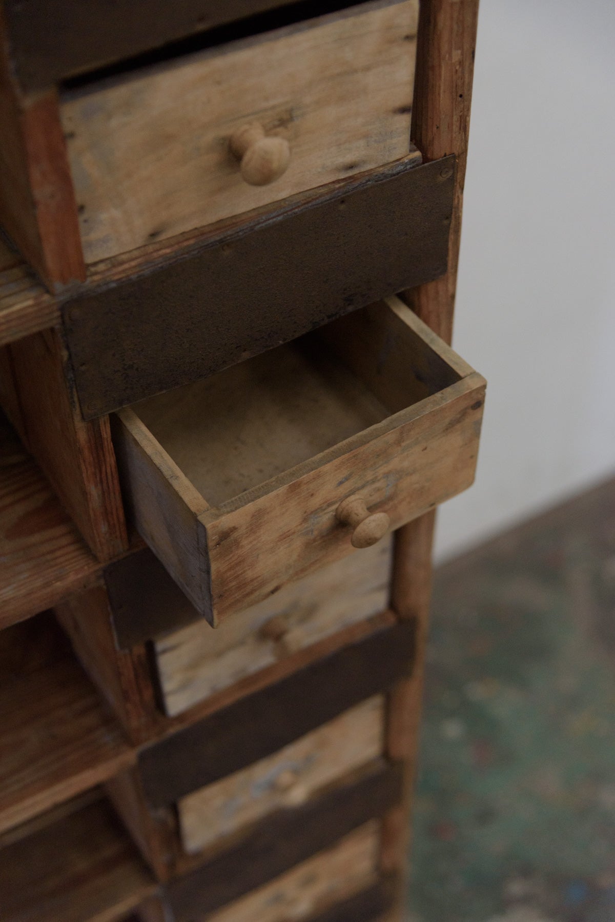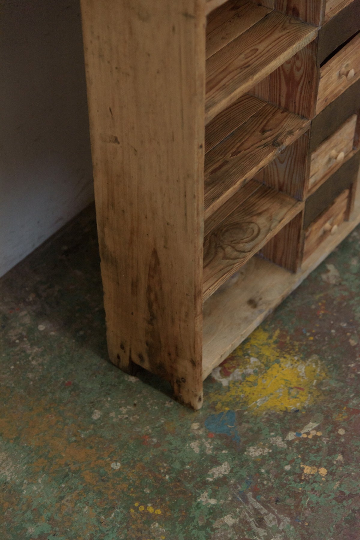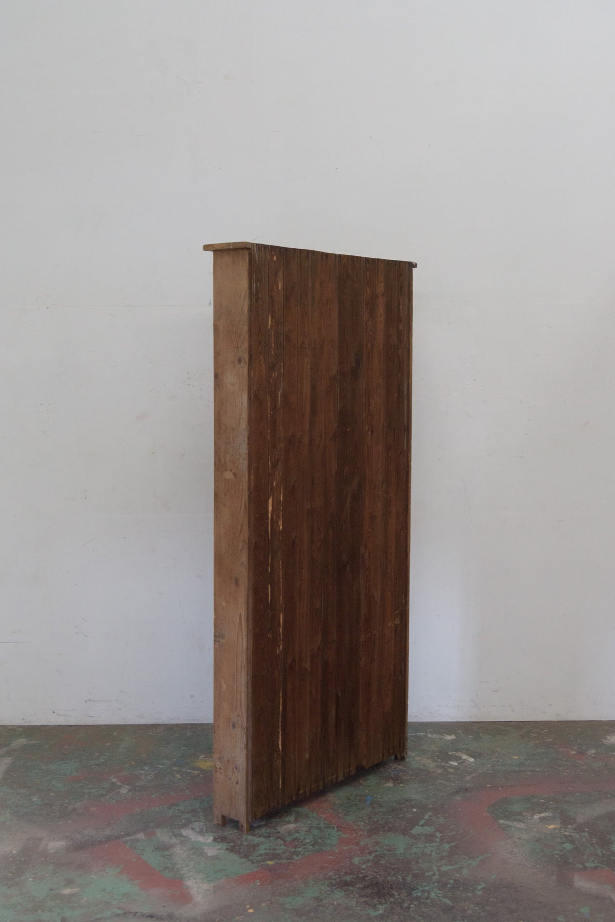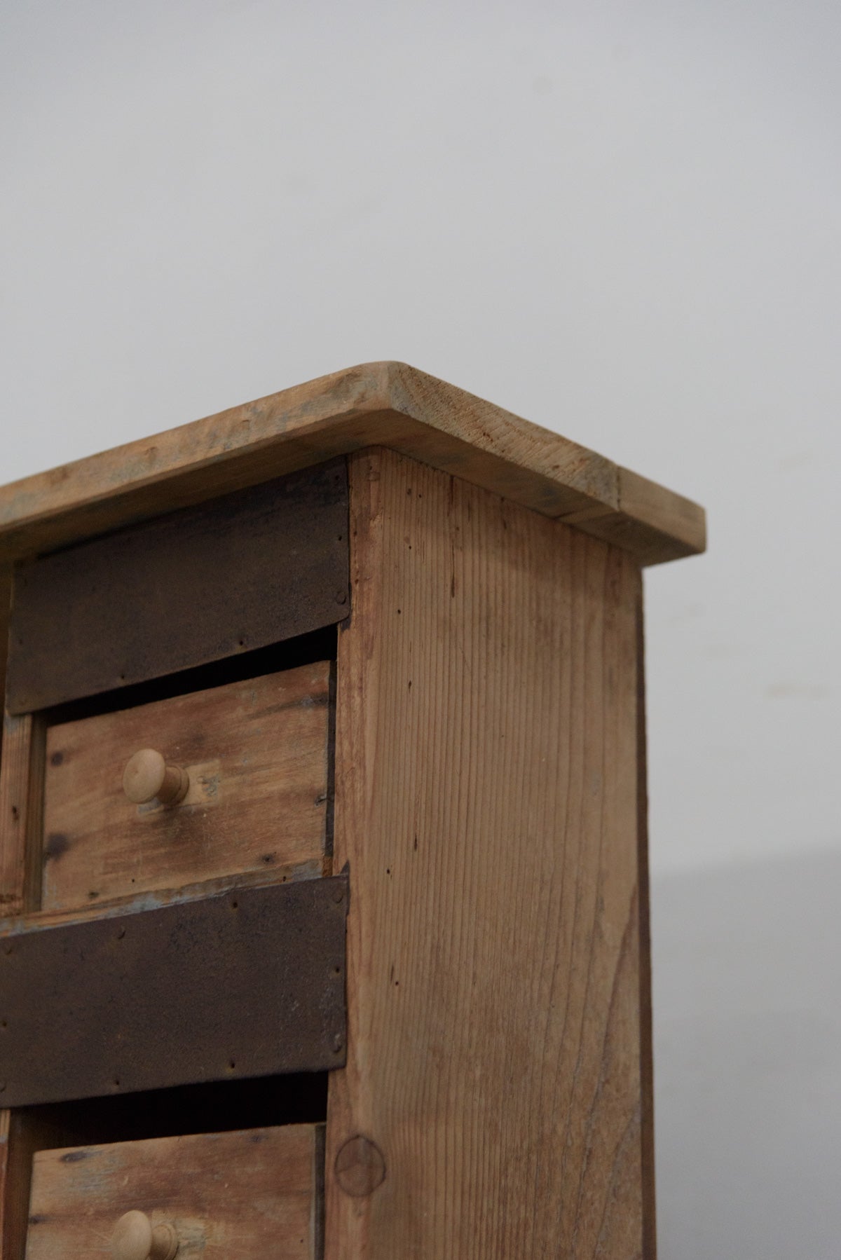 使っていた人が修理して手を加えていった形跡が魅力的な業務用の家具。パイン材の素朴な家具ですが、部分的に鉄も使われており小さな引き出し付きです。奥行きの小さな家具ですので壁に固定してお使いください。