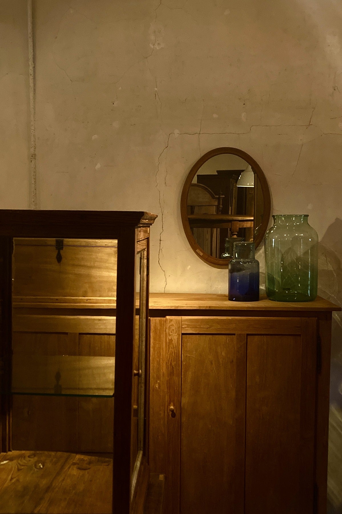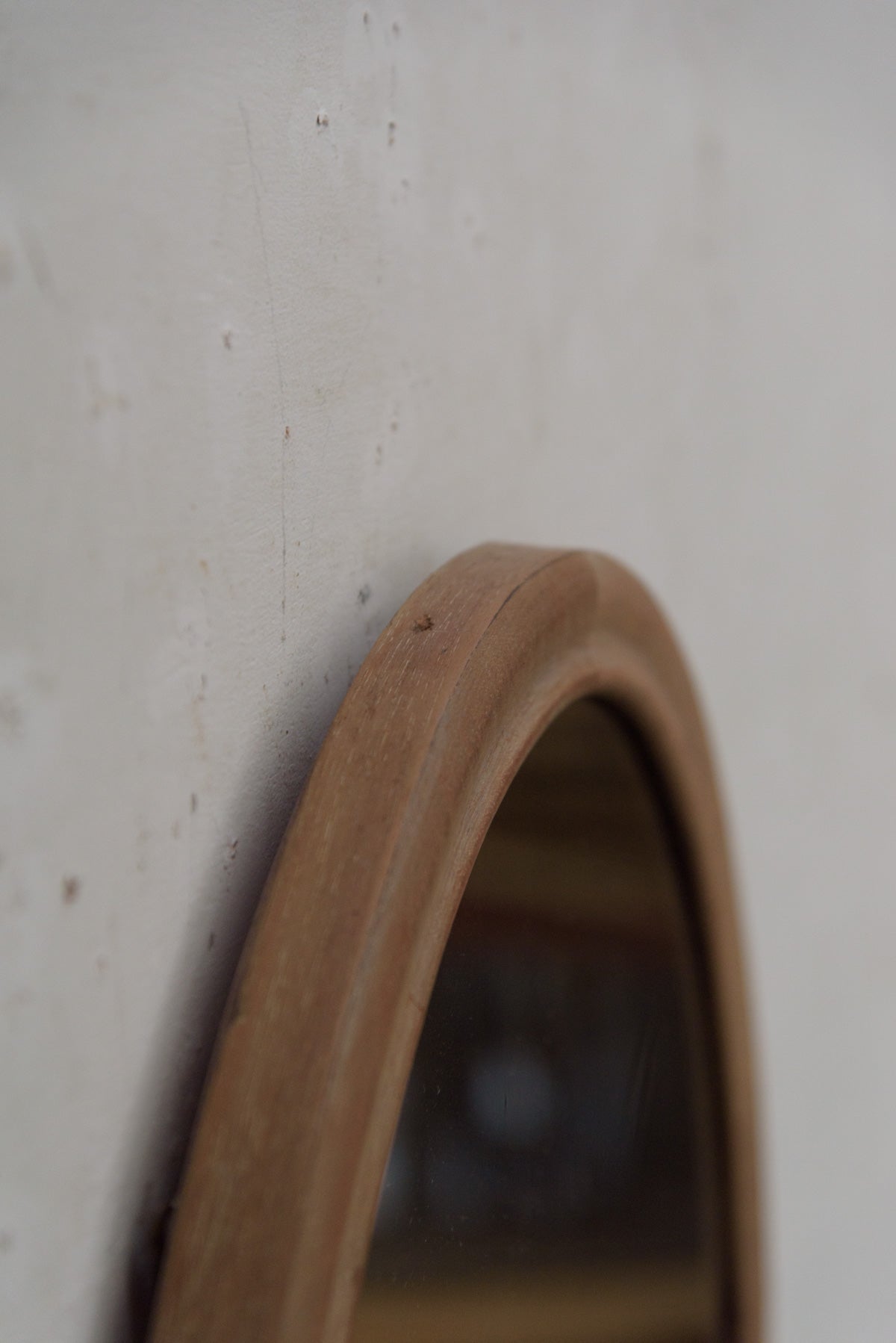 シンプルなミラーですが、四角のミラーでは出せないクラシックな佇まい。枠の材質はオーク、鏡の状態も比較的良いです。