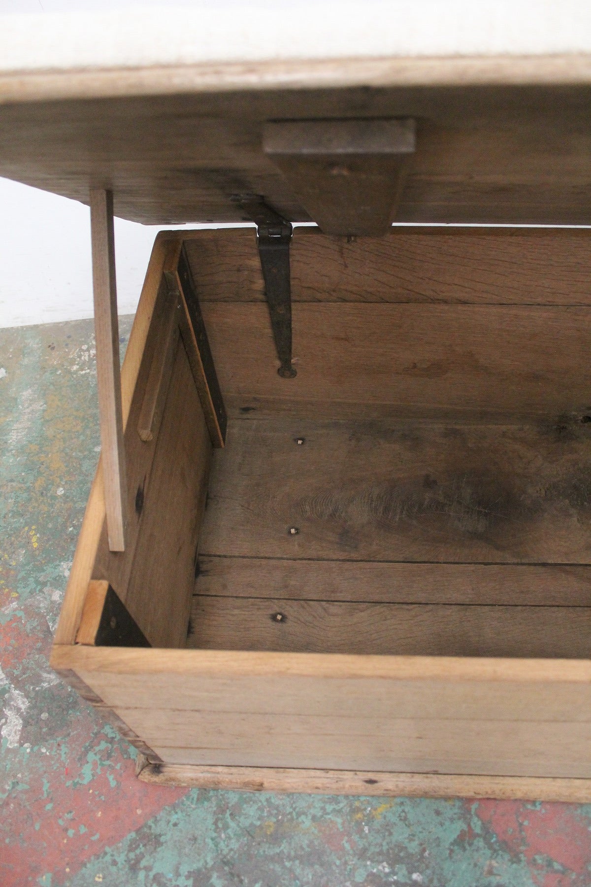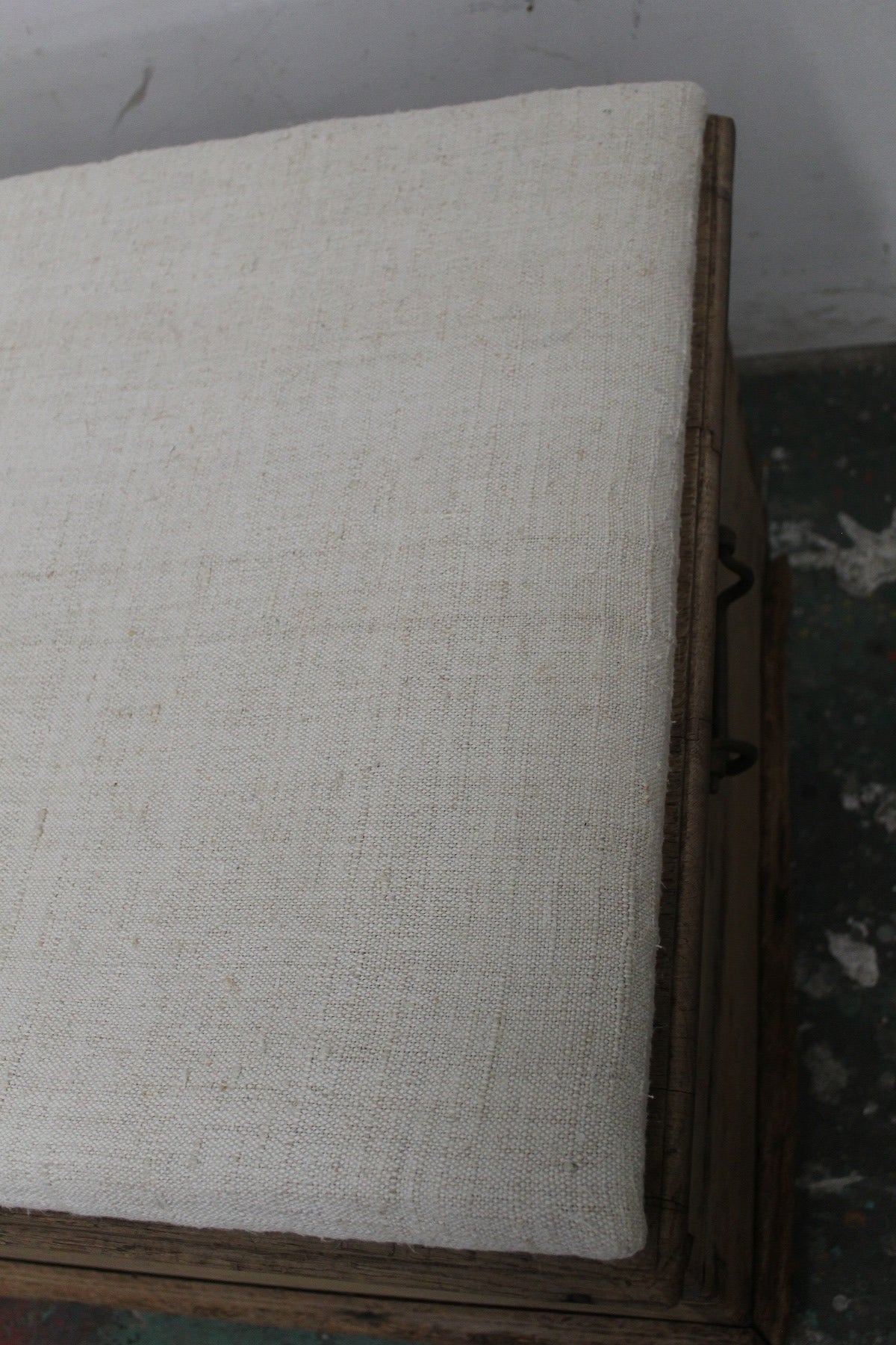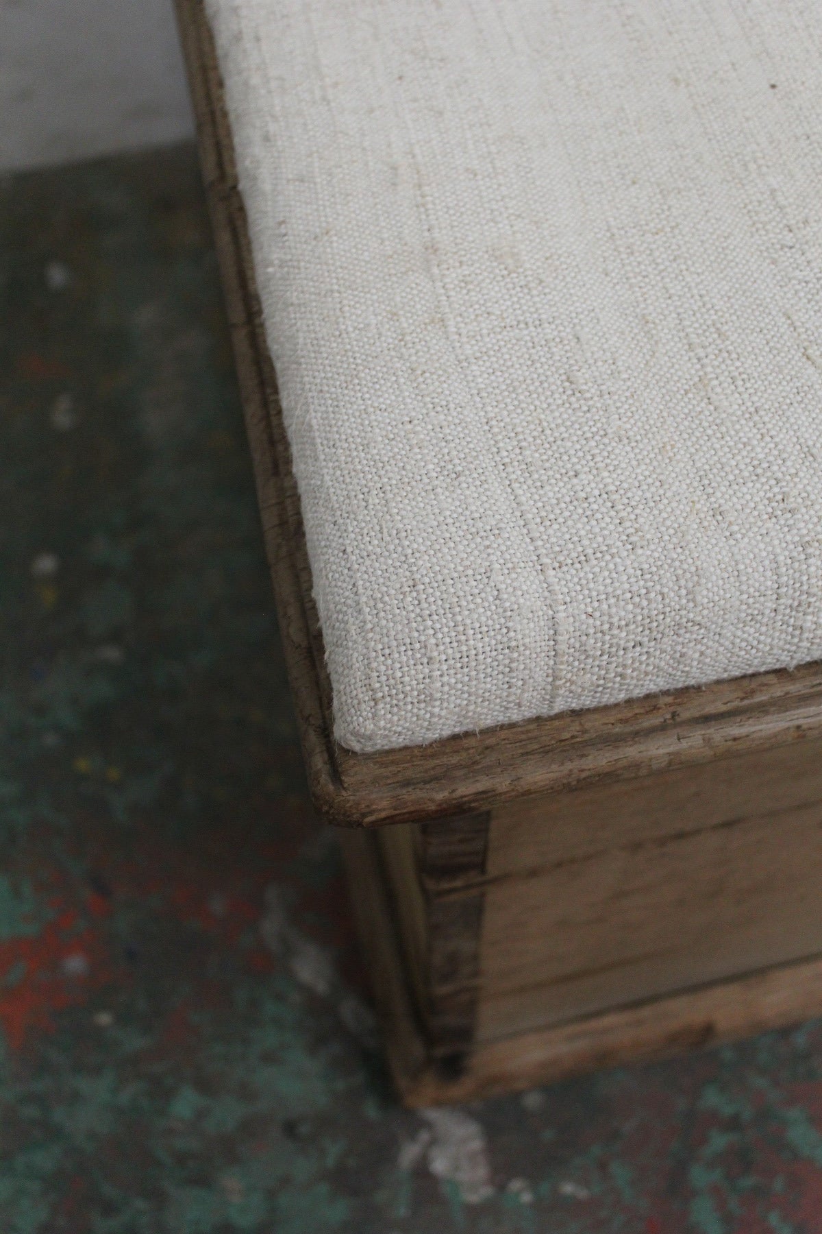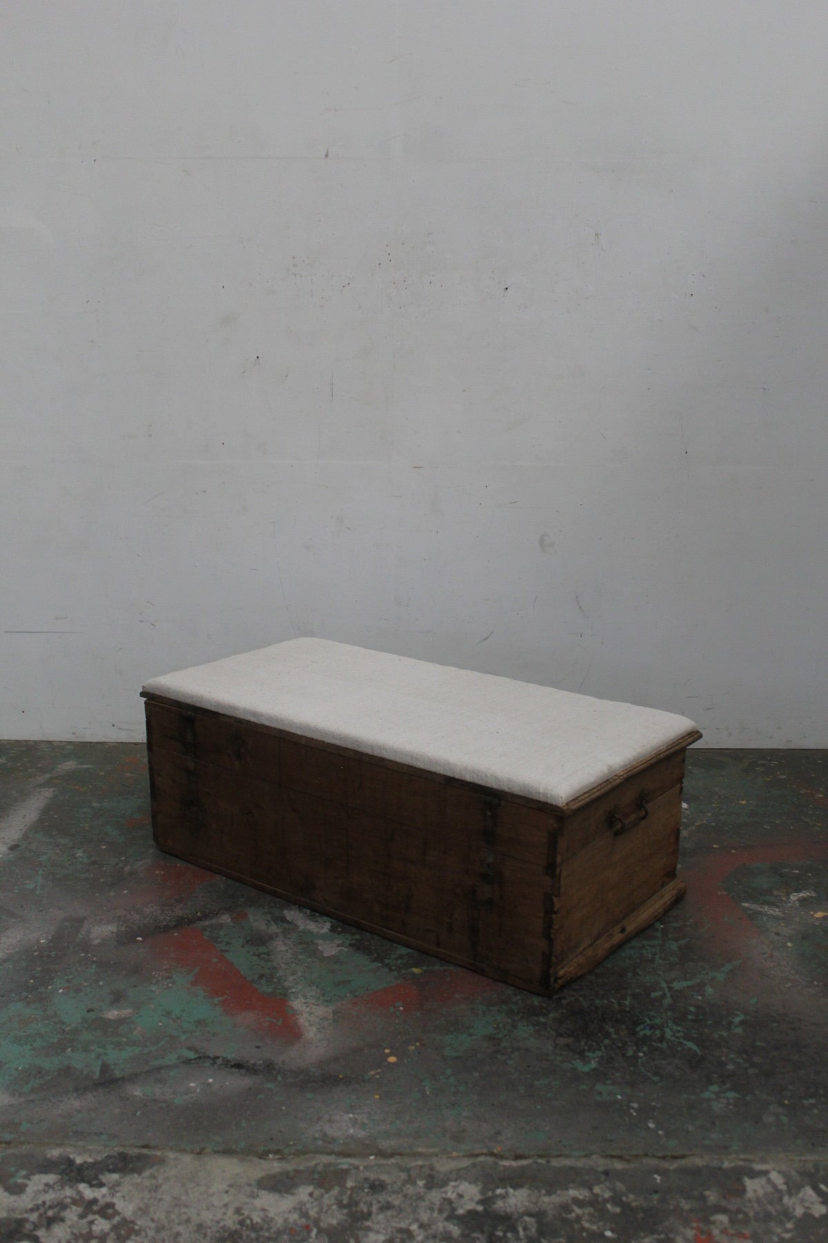 1800年代以前のかなり古い木箱で、当方にて天板にクッションを貼っています。東ヨーロッパのヴィンテージの麻生地を使用した、クッション2個付き。壁につけて小さなソファとして。