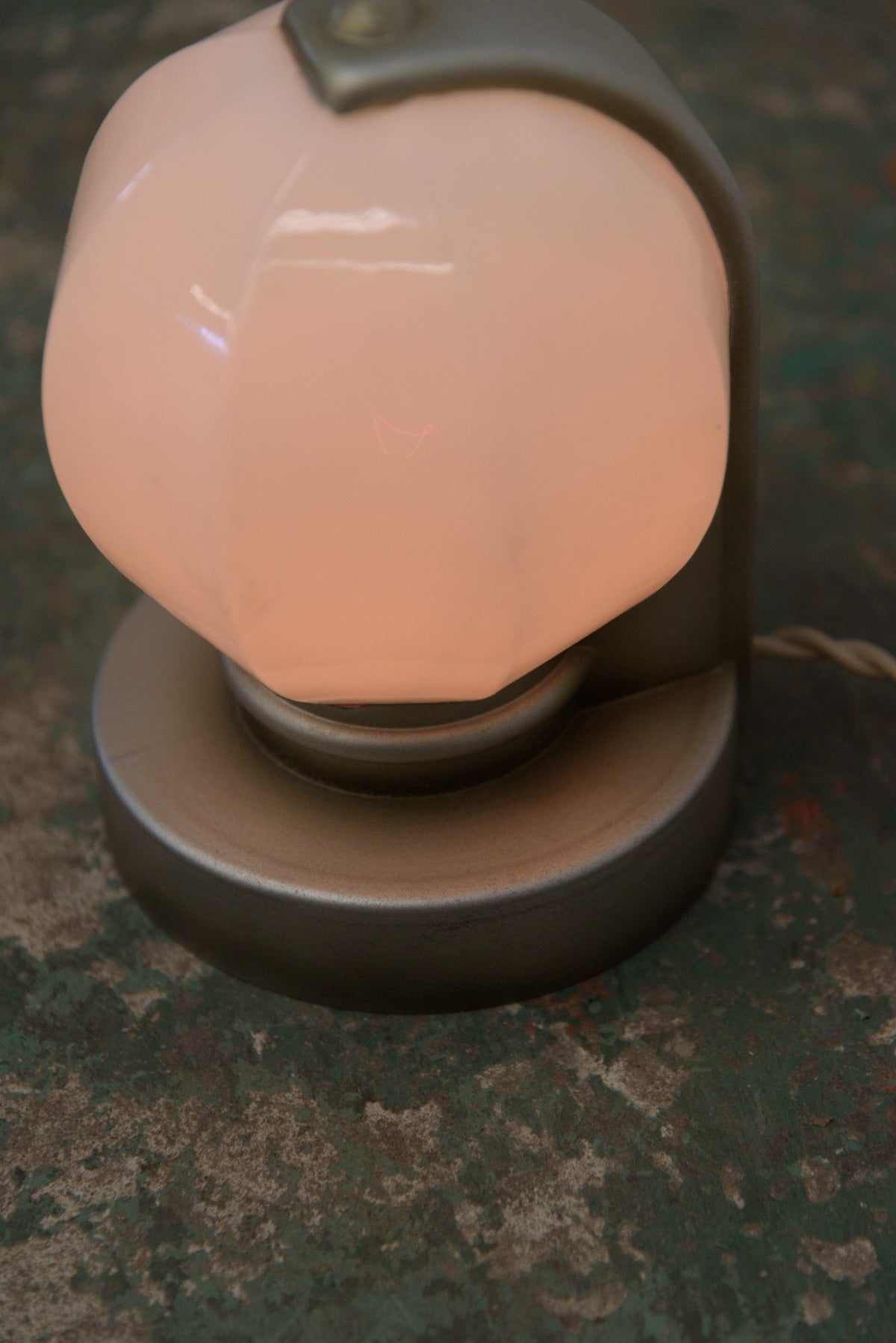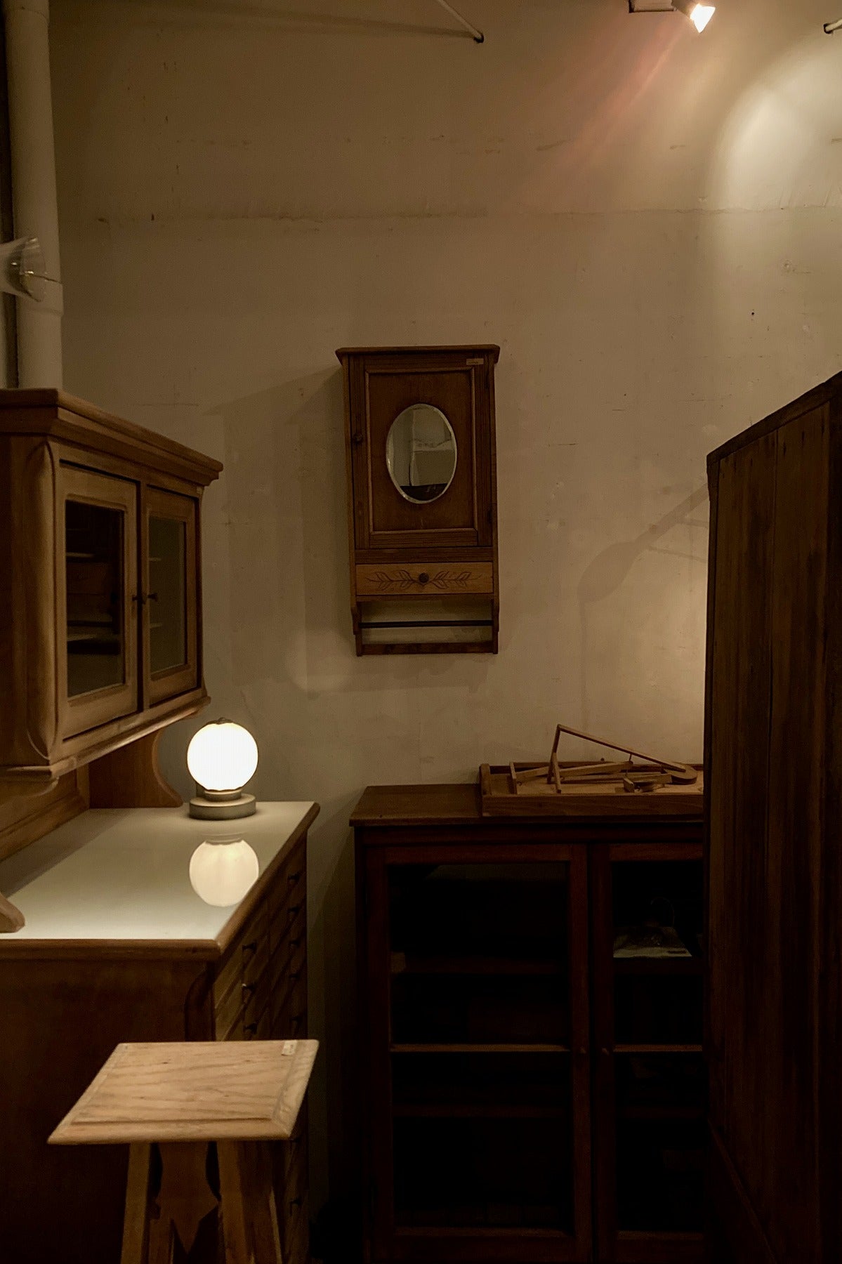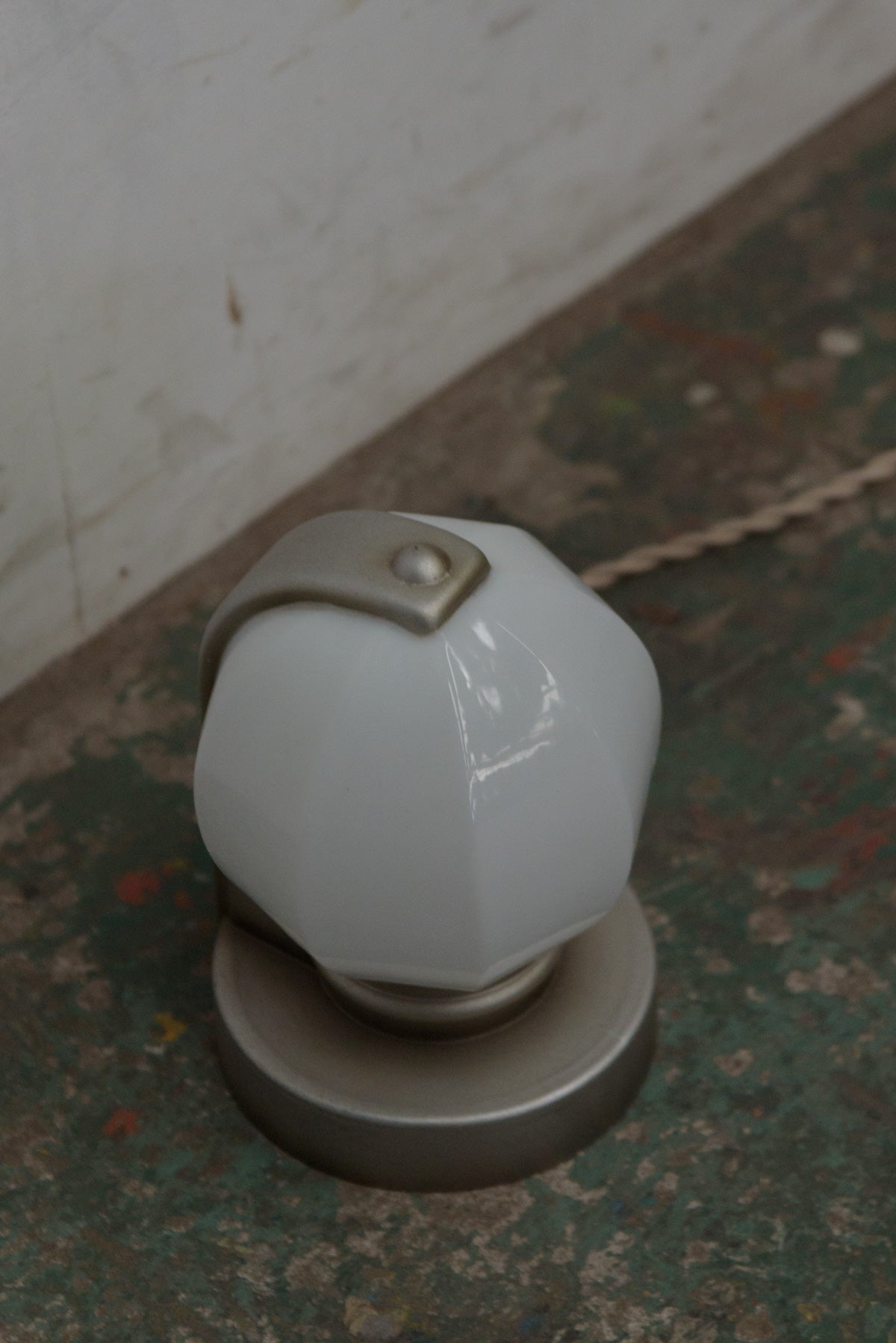 浴室で使われていた、ベースもすべてガラス製のめずらしいランプ。点灯すると全体がうっすらと光ります。電気部品は日本の新しいものに交換してます。口金は一般的なE26。コードの長さは約2.5mでコンセントプラグ仕様。コンセントから30cm程度の位置にスイッチ付き。