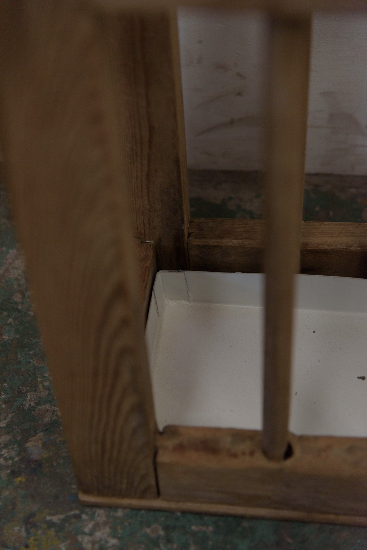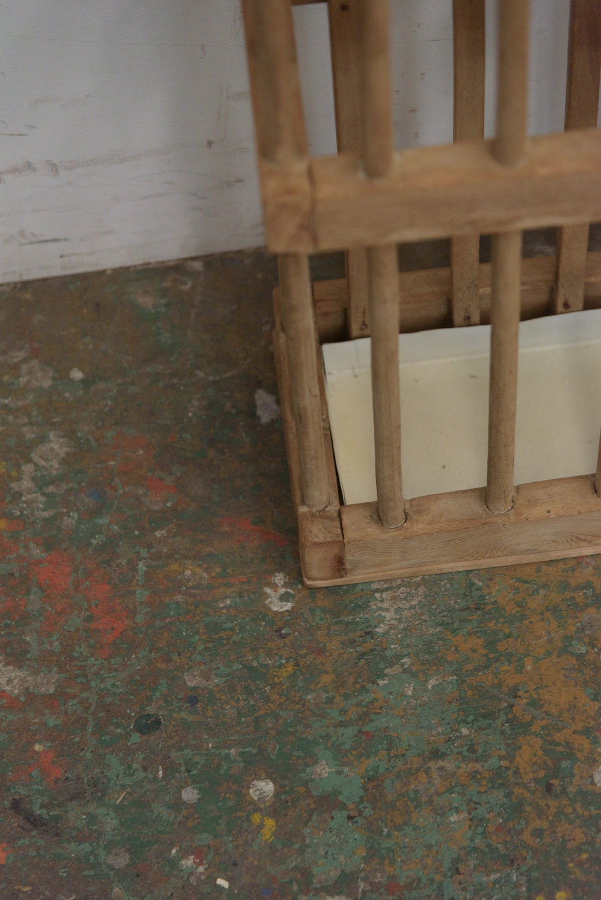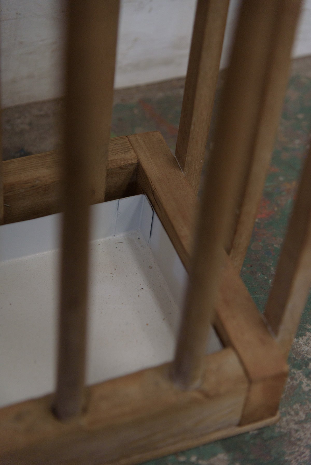 古い皿立てをリメイクした傘立てです。底の白いトレーは鉄製。