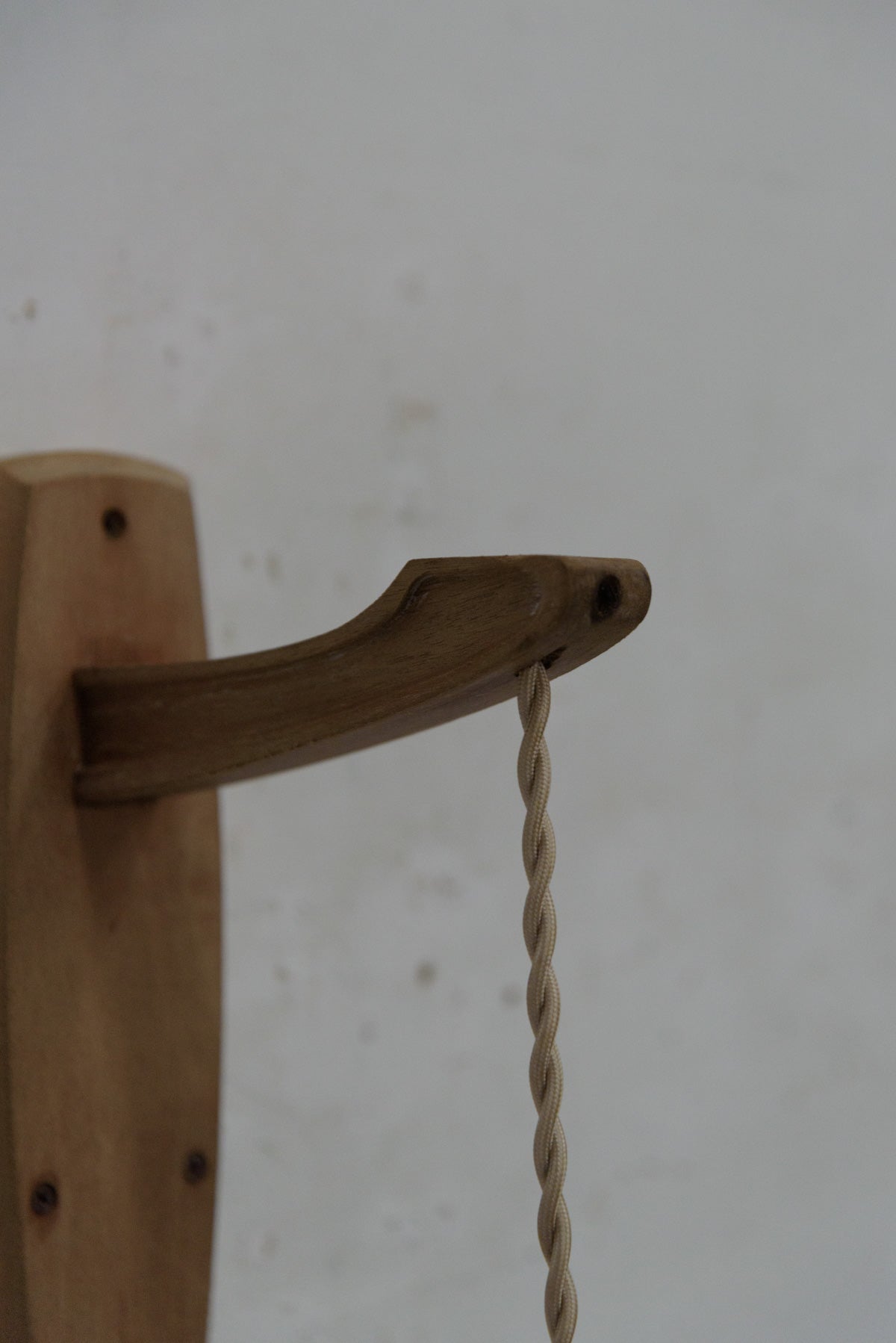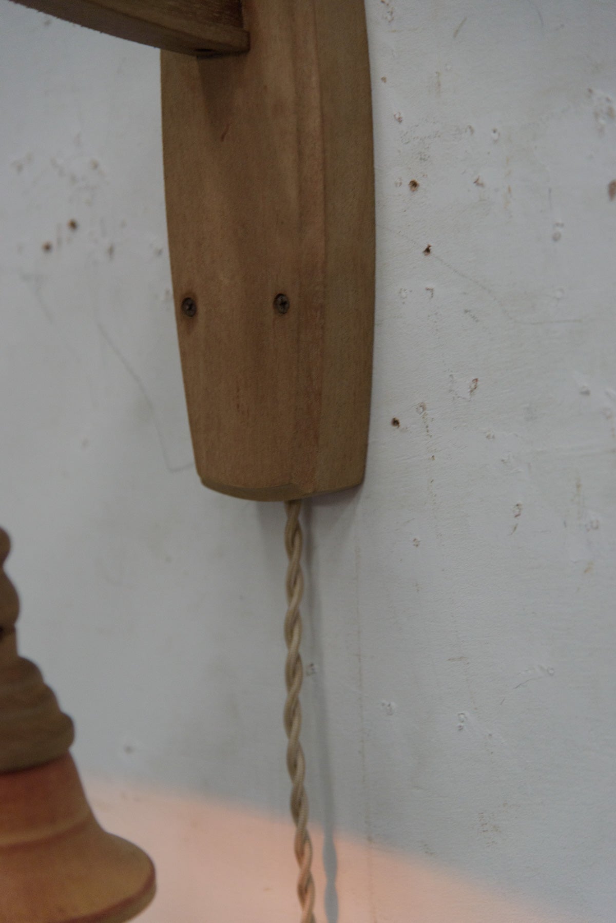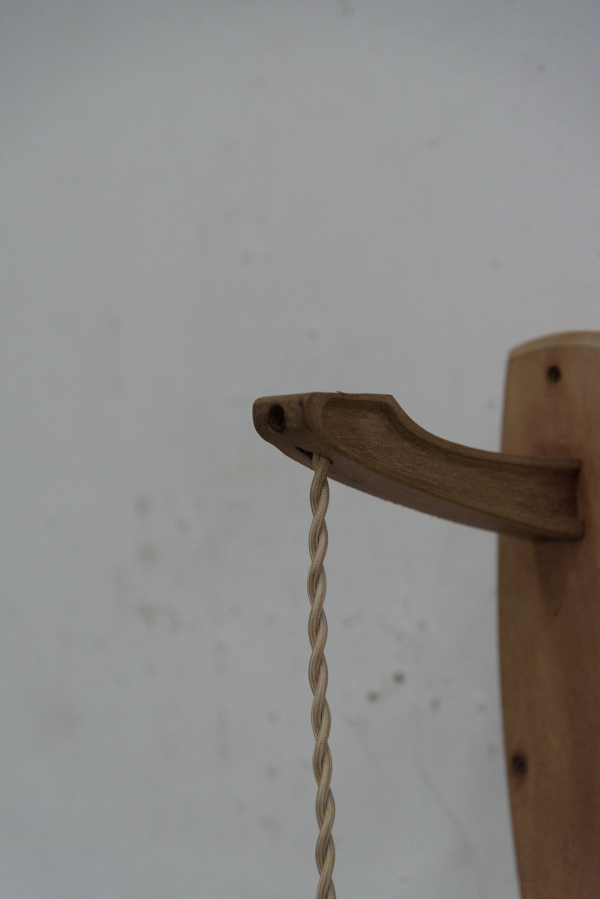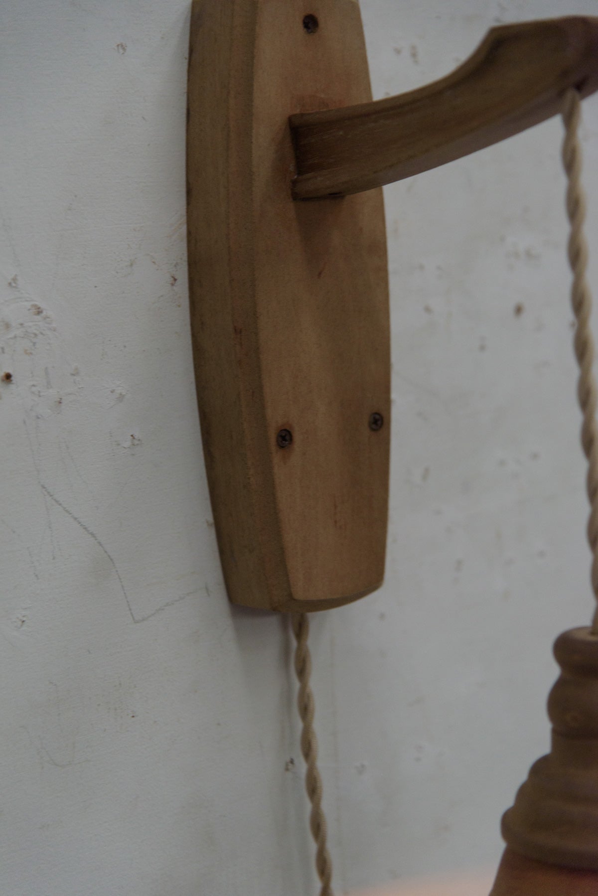 シェードの先端は鉄製、それ以外のパーツはビーチ材の古い木製のパーツを使用しています。電気部品は日本の新しいものに交換してます。口金は一般的なE17。コードの長さは約2.5mでコンセントプラグ仕様。コンセントから30cm程度の位置にスイッチ付き。