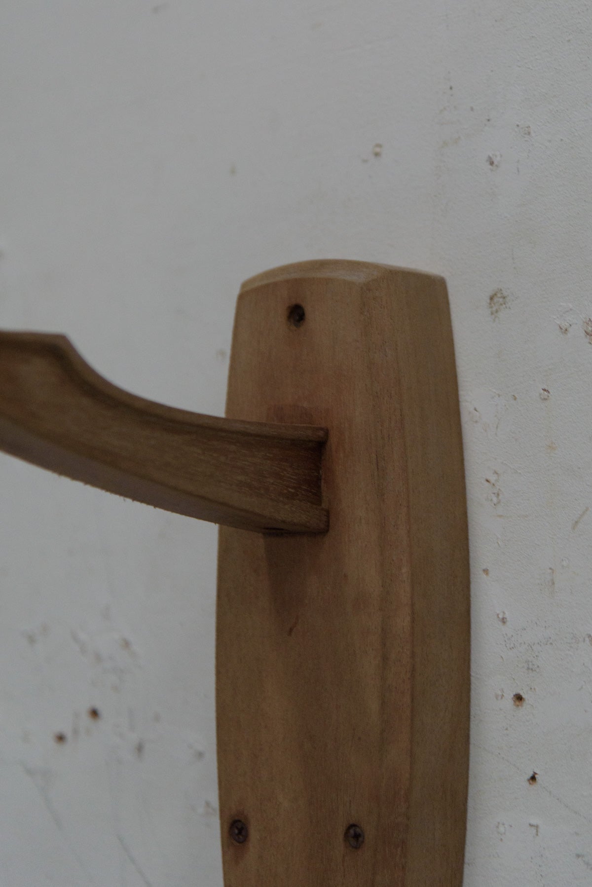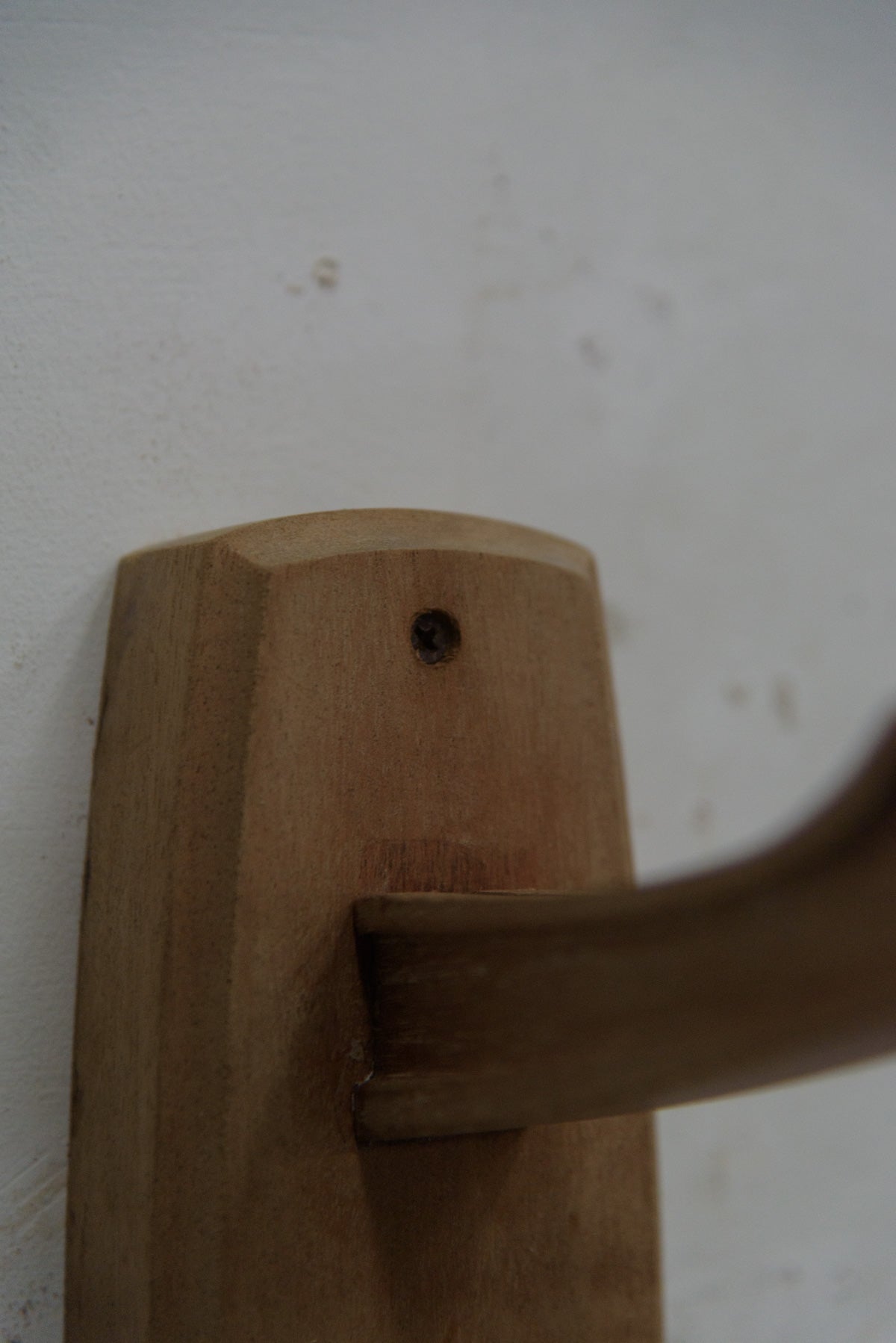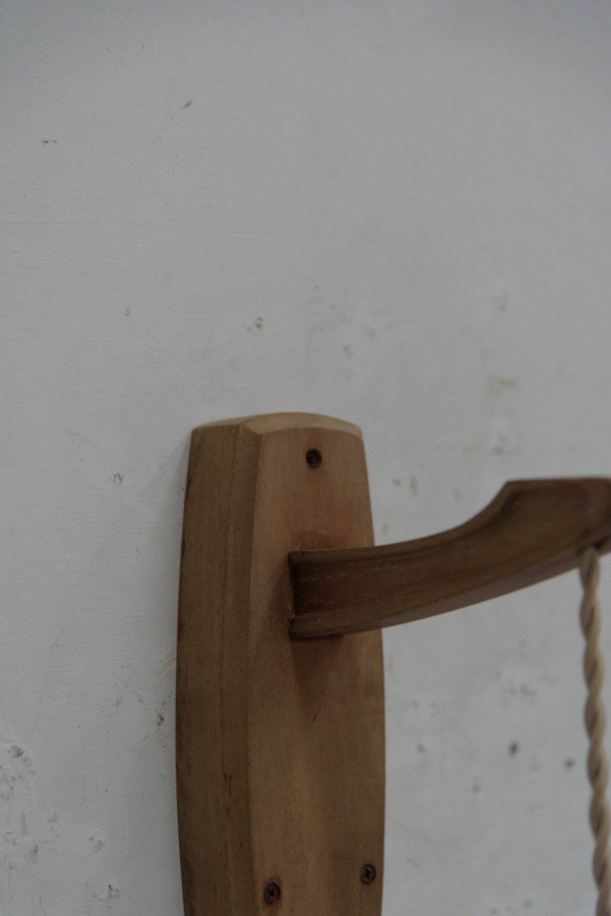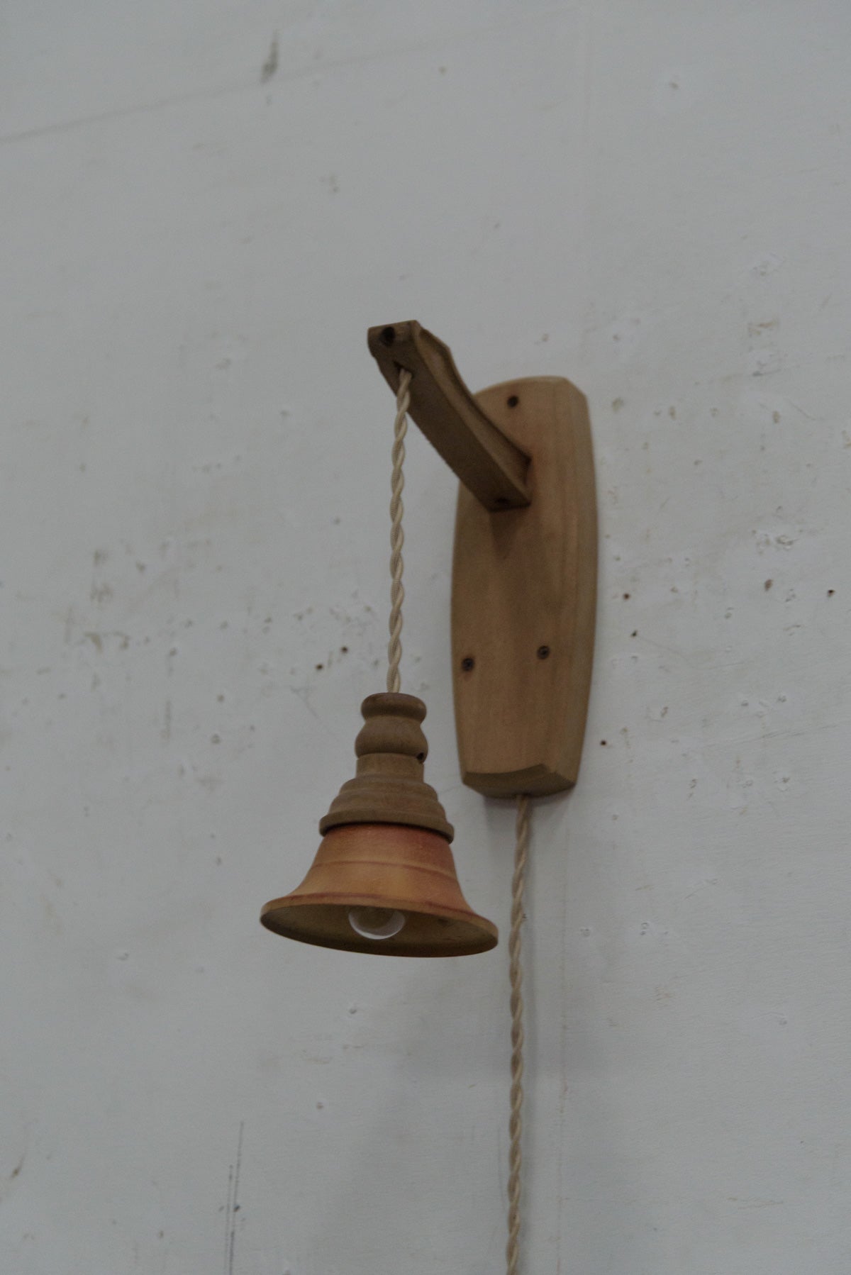 シェードの先端は鉄製、それ以外のパーツはビーチ材の古い木製のパーツを使用しています。電気部品は日本の新しいものに交換してます。口金は一般的なE17。コードの長さは約2.5mでコンセントプラグ仕様。コンセントから30cm程度の位置にスイッチ付き。